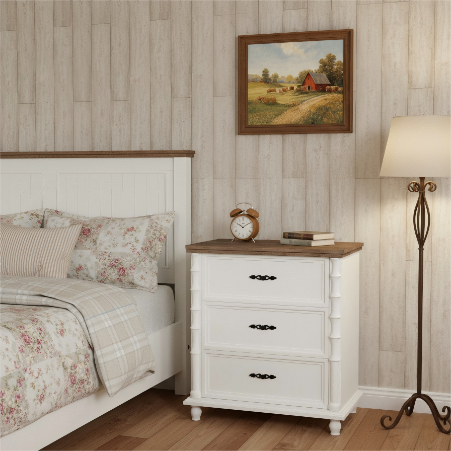 ODM/OEM ServiceWe provide ODM/OEM service for this 3-drawer cabinet, designed with a wood-grain top, white painted frame and decorative turned legs. Customers can specify overall size, drawer depth, color matching, hardware finish and packaging standard to align with local retail requirements.