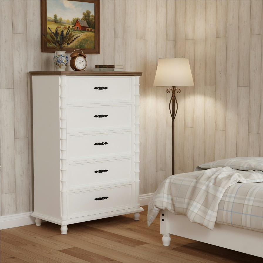 ODM/OEM ServiceWe offer ODM/OEM service for this tall 5-drawer chest, featuring a slim footprint, wood-tone top and white frame with classic turned posts. Height, width, drawer layout, finishes, hardware and runners can all be tailored to different markets, from compact city apartments to full bedroom suites.