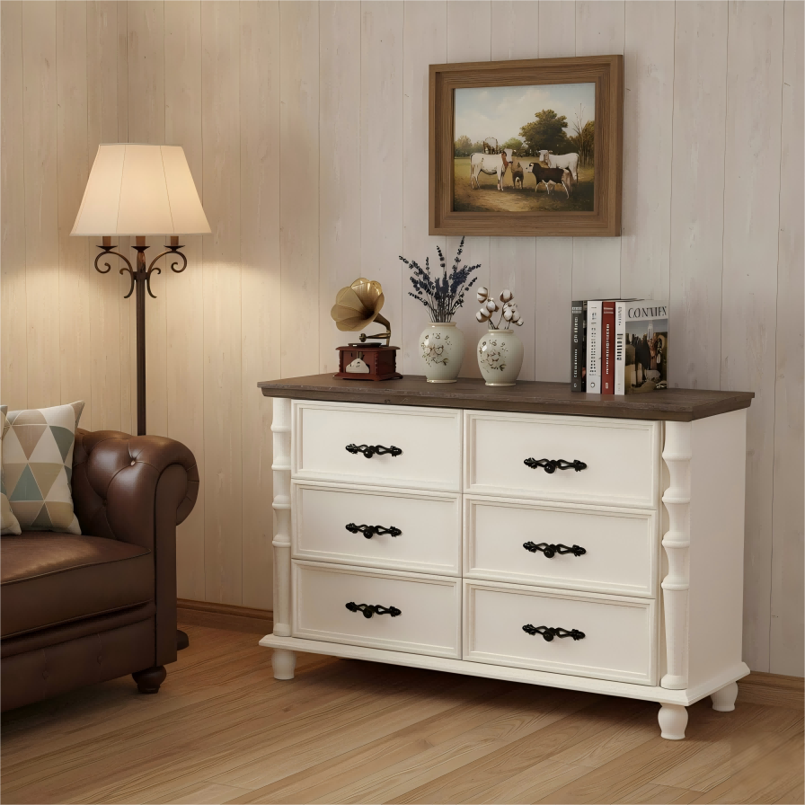 ODM/OEM ServiceWe offer full ODM/OEM service for this 6-drawer low chest, combining a contrasting wood top, white body panels and turned corner posts for a timeless cottage look. Dimensions, drawer configuration, paint color, top veneer, handles and internal structure can be customized to suit different room layouts and price levels.