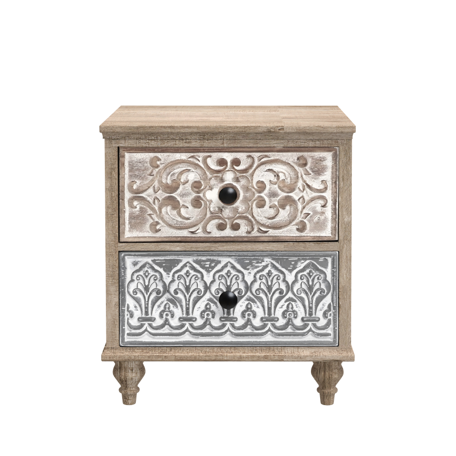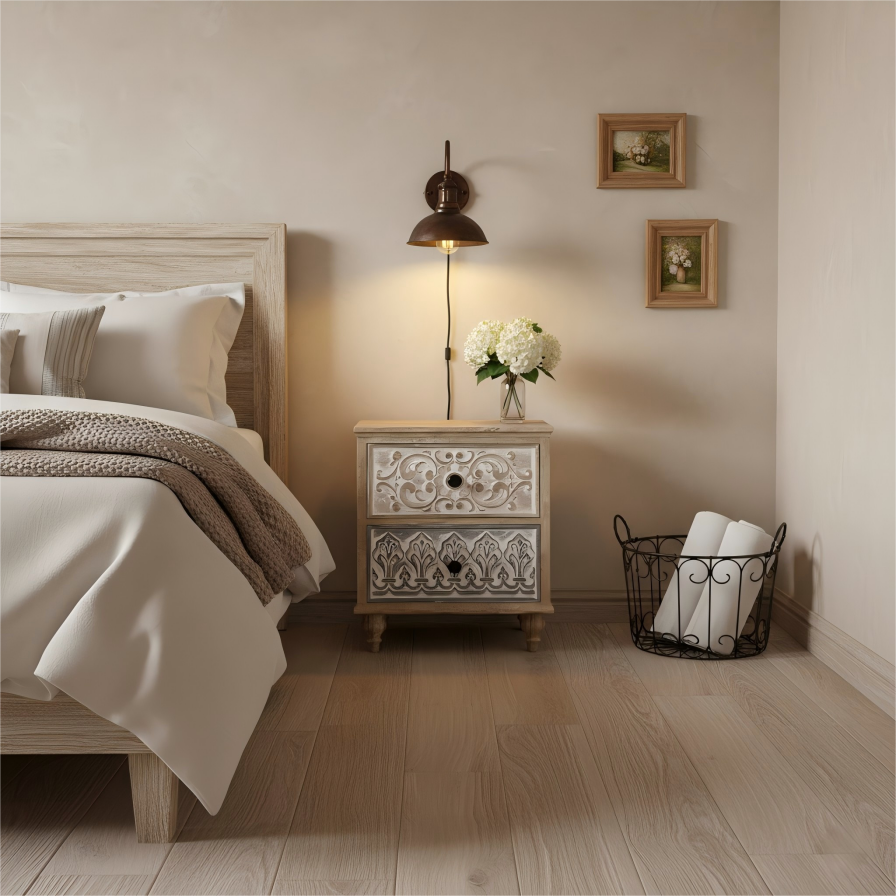 Compact and characterful: layered carving and rounded feet turn a bedside basic into a crafted accent.
