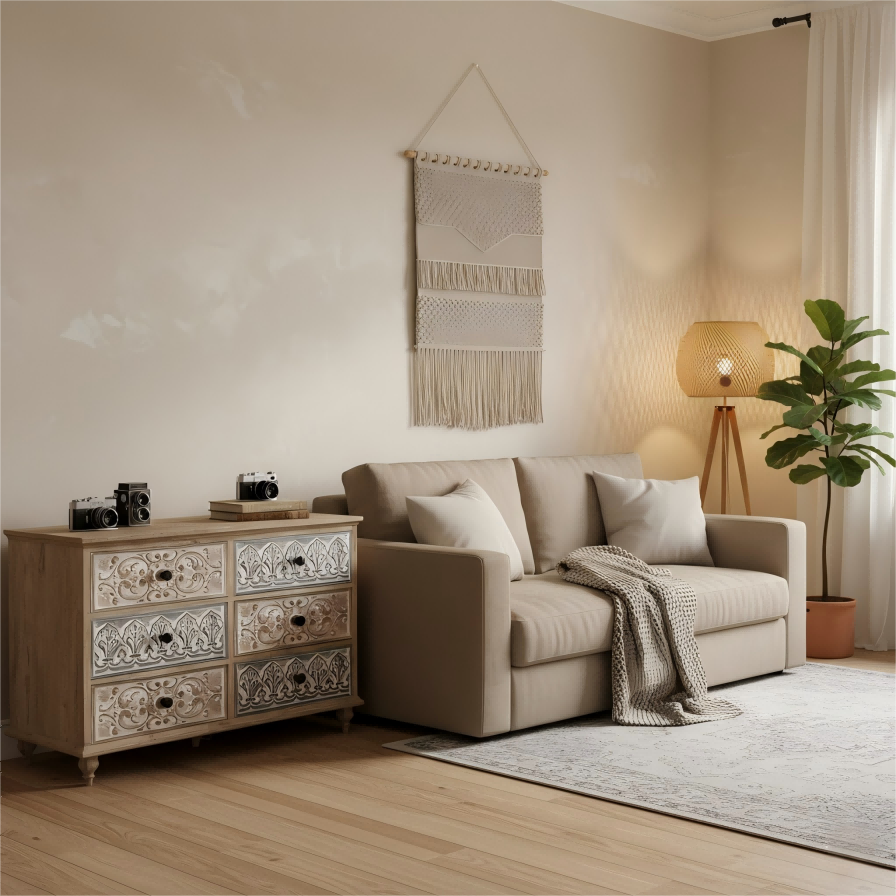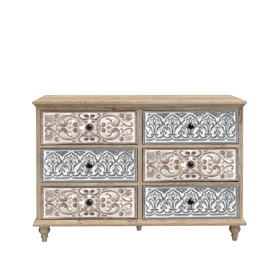 The Next Bestseller:Eye-catching relief pattern that photographs beautifully.Six organized drawers; smooth, quiet glides.Works from bedroom to entry without visual heaviness.