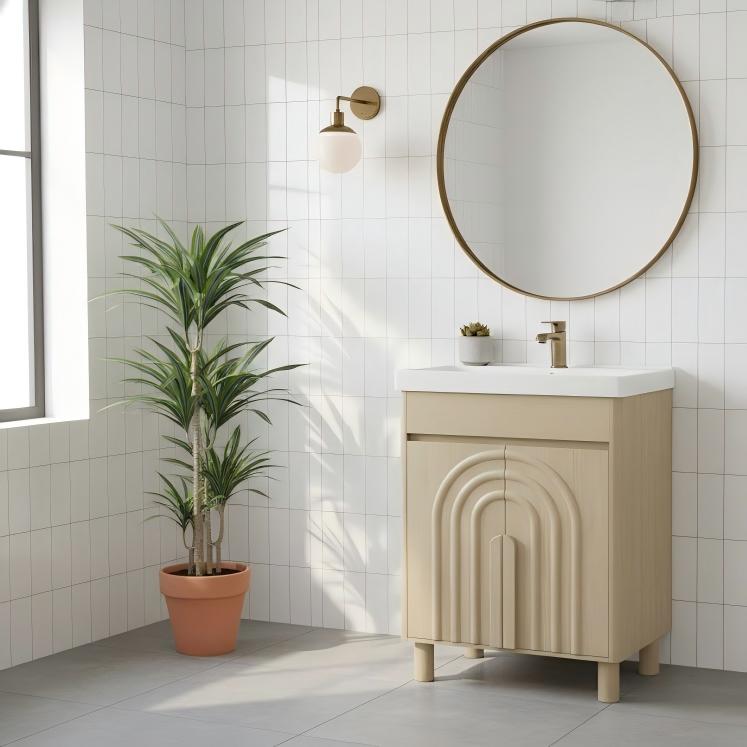 A calm, japandi vanity that softens geometry with arched relief doors and rounded edges. The integrated basin keeps the profile clean, while elevated cylindrical legs bring lightness and easier floor care.
