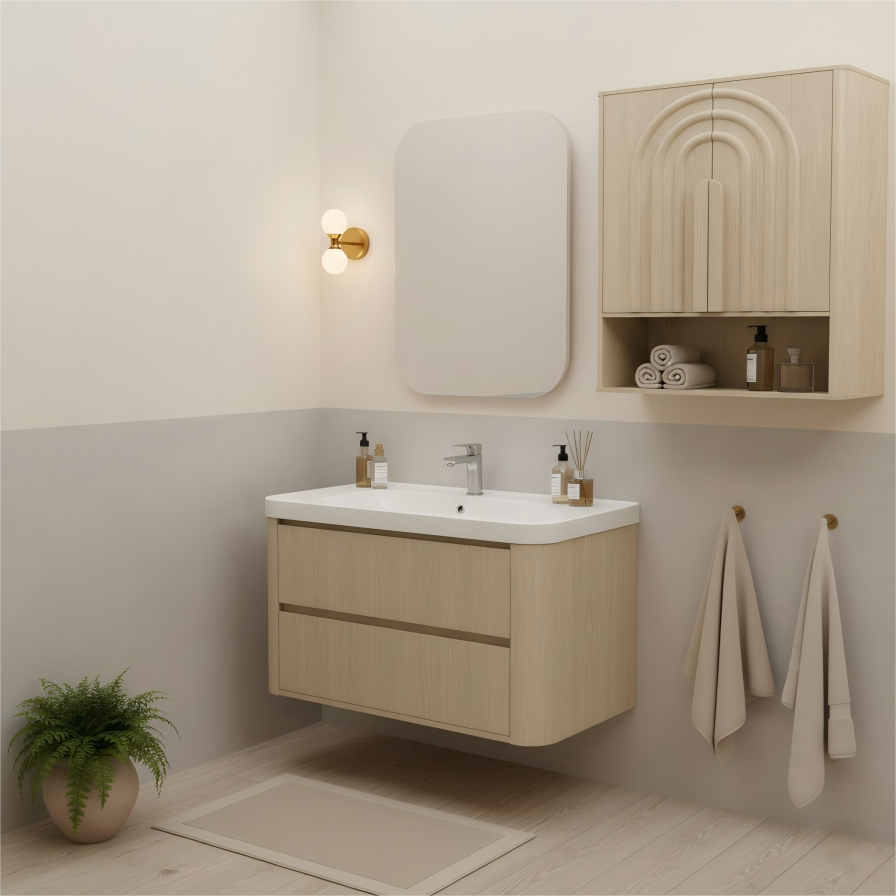 The Next Bestseller:Arch-front doors add instant style to small bathrooms.Closed + open storage in one slim cabinet saves wall space.Soft wood tone and curves fit Scandi, Japandi and family bathrooms.