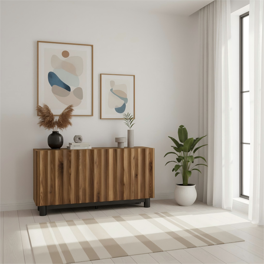 A 3-door sideboard with a continuous fluted façade that brings rhythm to warm walnut grain. Soft-radius ends and hidden groove pulls keep the look seamless, while the 150-cm span balances presence and lightness for dining rooms, entries, or living spaces.