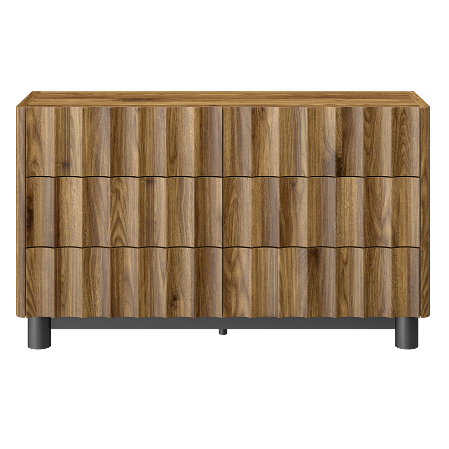 A six-drawer dresser (140.5×42×83 cm) with a continuous scalloped/fluted façade and soft bullnose edges. The warm walnut grain meets matte cylinder legs for a refined, tactile look that pairs with soft-modern and Japandi bedrooms.