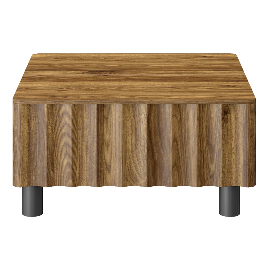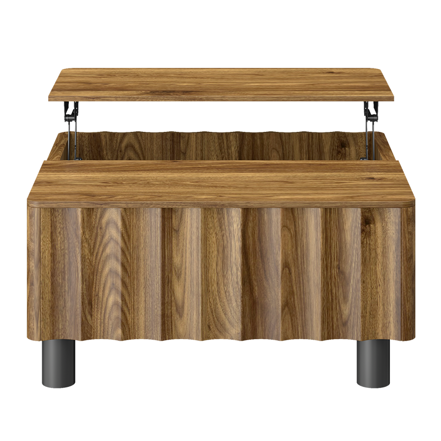 A compact lift-top coffee table with a fluted walnut façade and rounded corners. The top elevates smoothly to a lap-height work surface while concealing a large storage well; matte tube legs keep the profile light and urban.
