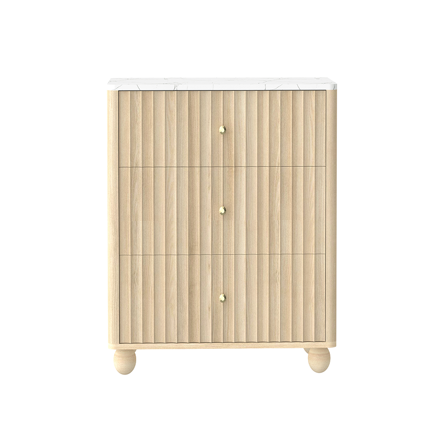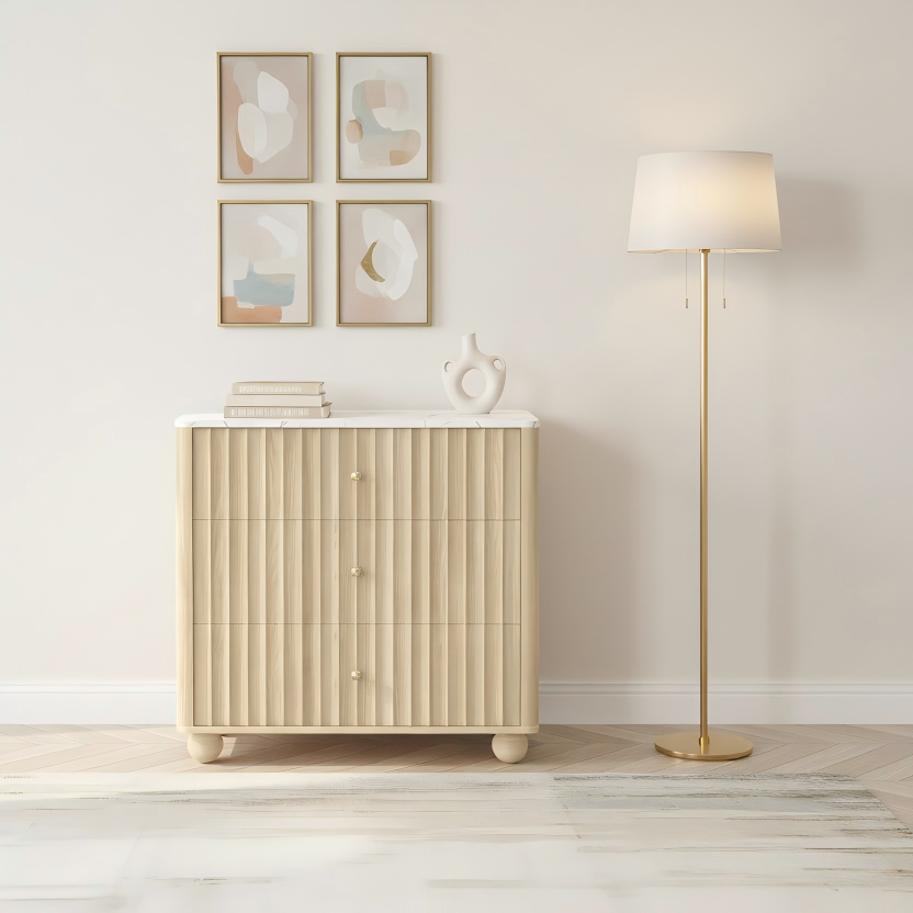 A neat 3-drawer chest that blends a fluted front with a marble-look top and soft ball feet. The warm blonde-oak tone, rounded corners, and slim metal knobs create a calm, light profile that slips into bedrooms, hallways, and living spaces without visual weight.