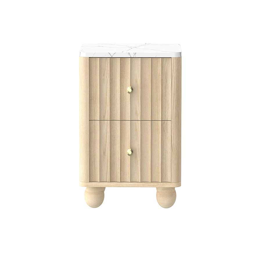 ODM/OEM ServiceWe provide ODM/OEM service for this compact bedside cabinet with marble-look top, fluted front and ball feet in a light wood tone. Overall size, door/drawer configuration, interior shelf, knob finish and colors can all be tailored to different mattress heights and bedroom concepts.
