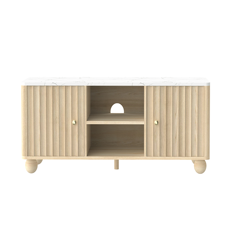 ODM/OEM ServiceWe offer ODM/OEM service for this TV cabinet combining a slim marble-effect top, rounded corners, vertical slatted fronts and ball feet. Length, depth, media compartment layout, cable management, door style, finishes and leg height can all be customized for different screen sizes and markets.