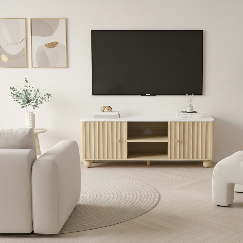 Low-profile TV console with a slatted light-oak front and slim marble-look top. Soft radii + bun feet; adjustable shelves and rear cable ports keep gear tidy.