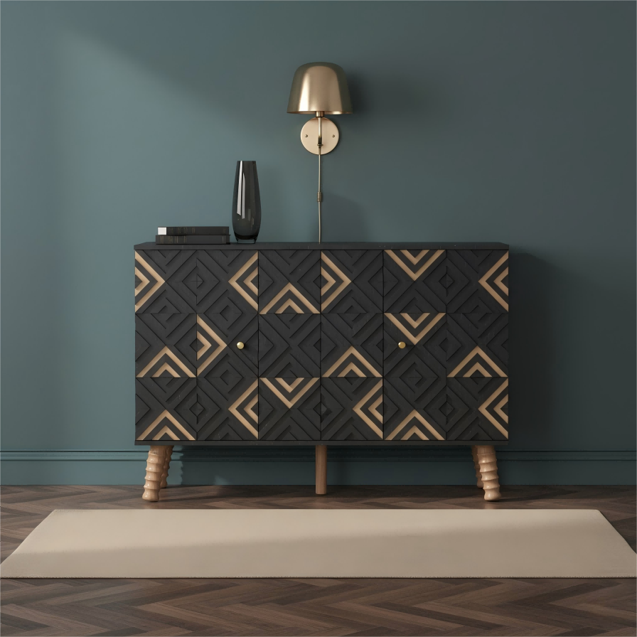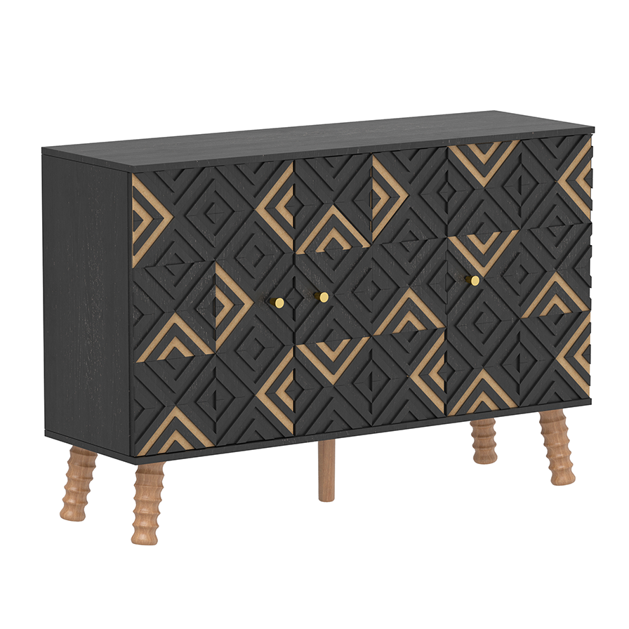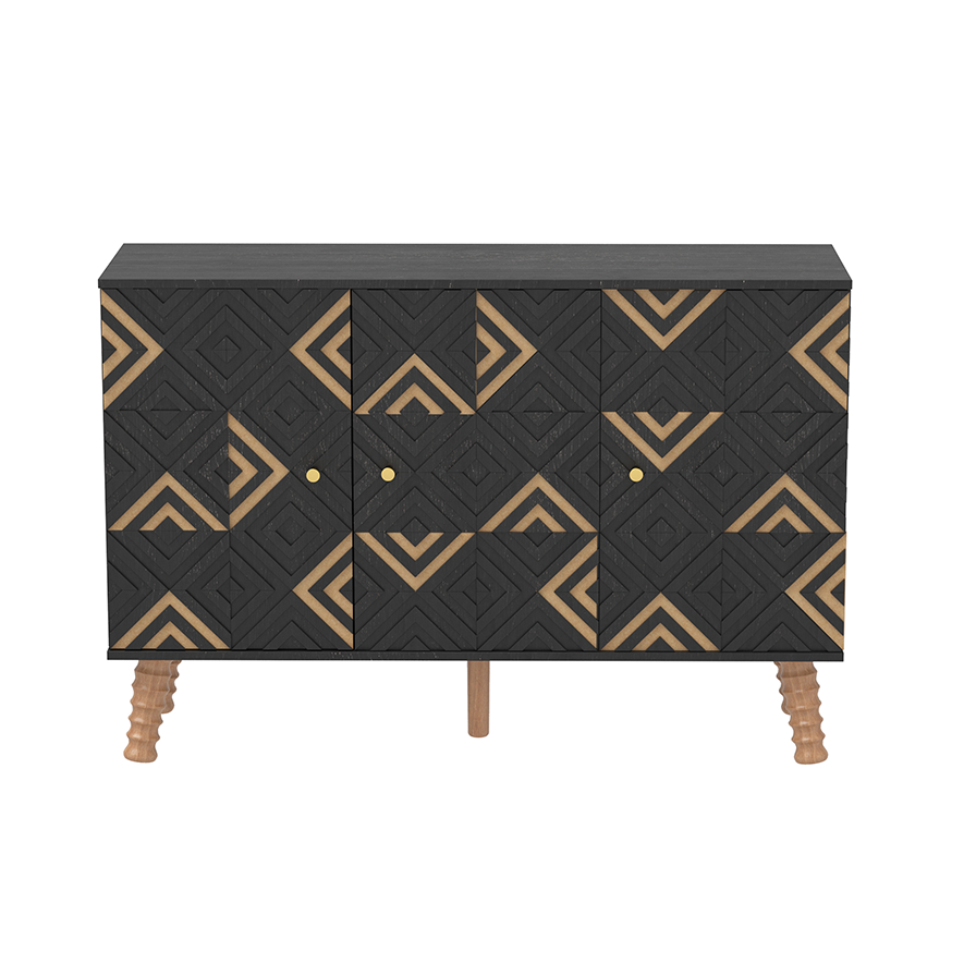 ODM/OEM ServiceWe provide ODM/OEM service for this low sideboard with continuous geometric carving across the front and angled turned legs. Length, depth, door/drawer arrangement, internal shelving, body color, leg finish and knob details can all be customized to suit dining rooms, living rooms or hotel suites.
