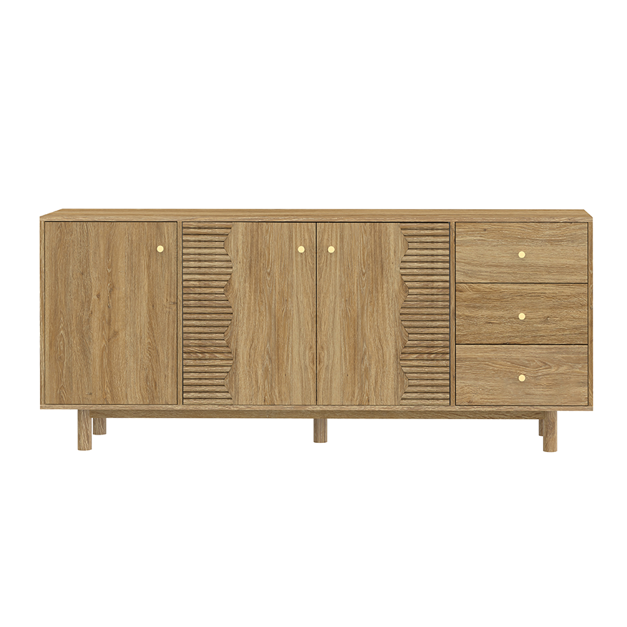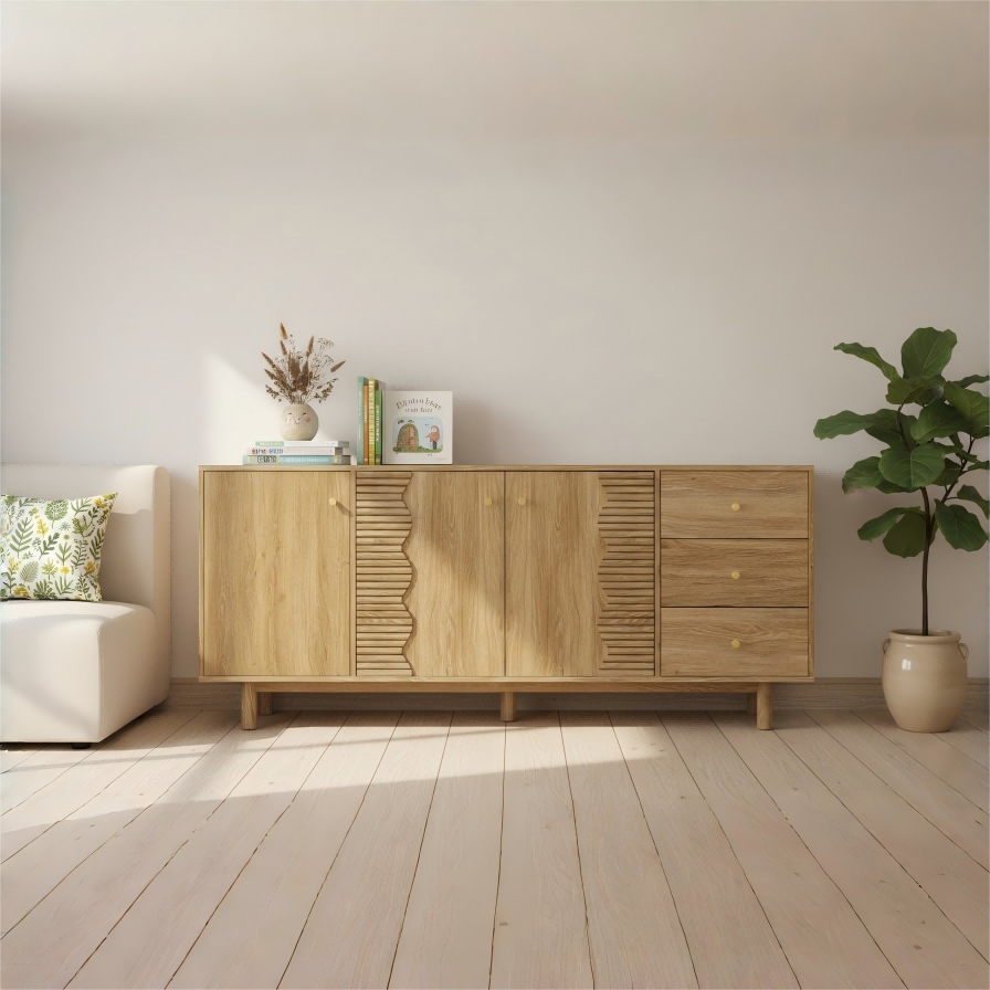 ODM/OEM ServiceWe offer ODM/OEM service for this 180 cm sideboard that mixes plain oak doors with wave-accent fronts and drawers on slim legs. It provides generous storage for dining rooms or living spaces while keeping a clean, modern look. Door/drawer layout, internal shelves, finishes, knobs and leg design are all open to customization.