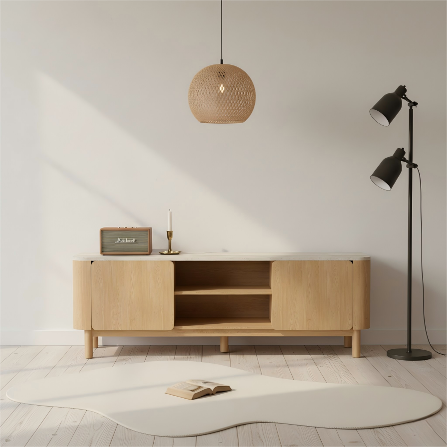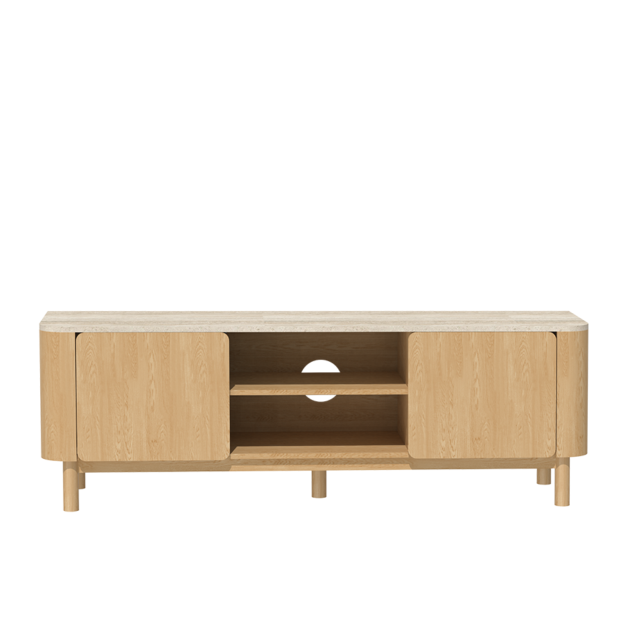 ODM/OEM ServiceWe provide ODM/OEM service for this TV cabinet featuring a stone-look top, rounded ends, center media niche and side storage on slim round legs. Length, depth, cable management, door/drawer layout, finishes and hardware can all be customized to fit different TV sizes and markets.