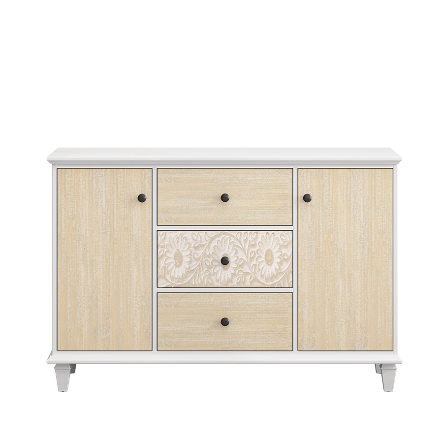 ODM/OEM ServiceWe offer ODM/OEM service for this sideboard that combines two doors with three drawers, a white top and frame, light wood fronts and a decorative carved bottom drawer. Internal shelving, drawer sizes, carving style, handles and finishes can all be tailored for dining rooms, living rooms or hallways.