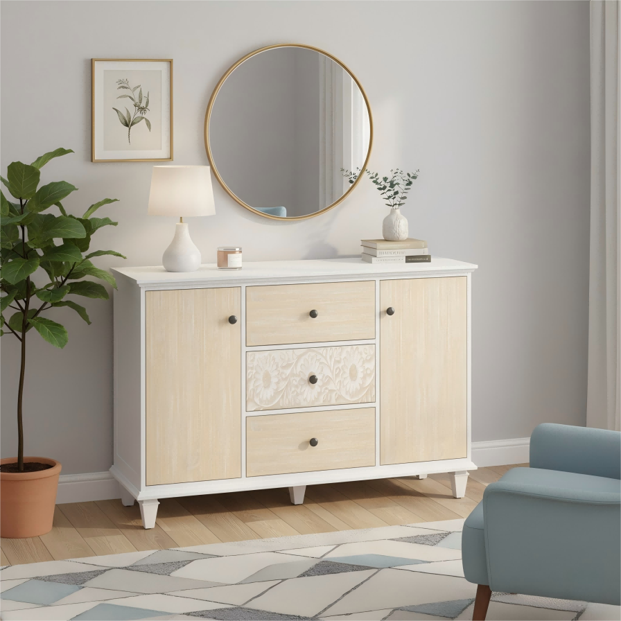 Two-tone sideboard (1200×390×800 mm): crisp white shell, light-wood fronts, and one sculpted botanical drawer. Soft-minimal look aligned with 2025 quiet-luxury + tactile-texture trends; slim 390 mm depth fits halls and compact dining/living spaces.