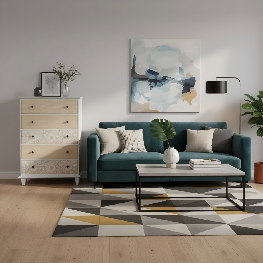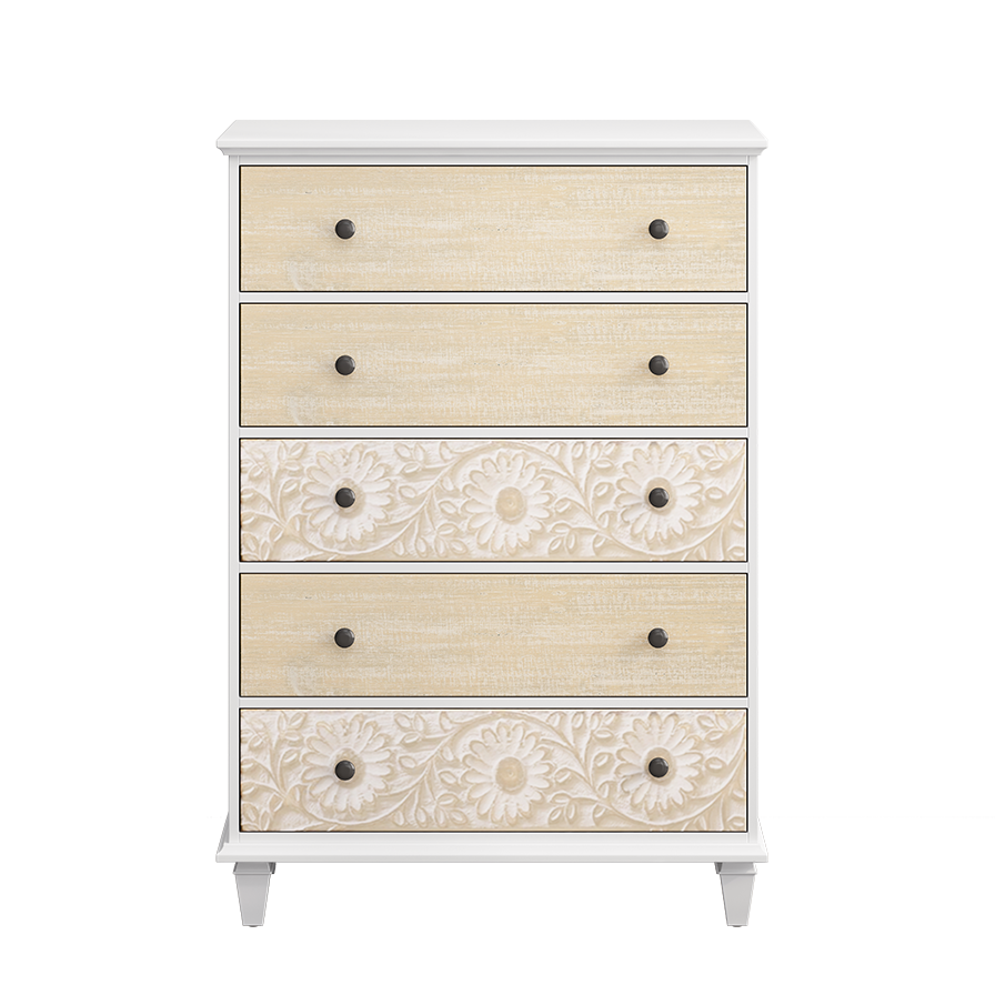 A tall 5-drawer dresser (800×390×1150 mm) that pairs a crisp white case with sun-washed wood and two carved-floral fronts. The soft-minimal silhouette taps 2025’s “quiet luxury” and “tactile texture” trends, while the slim 390 mm depth keeps bedrooms and apartments feeling airy.