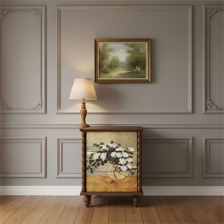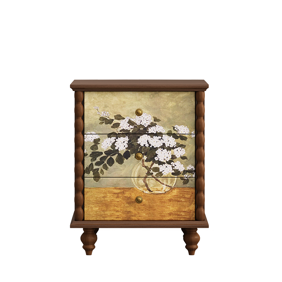 The Next Bestseller:Seamless art-on-drawer façade delivers a thumb-stopping hero shot.Beaded posts + turned legs hit the warm vintage / cottagecore trend.Small but useful storage; universal sizing for nightstand or hallway chest.Full KD flat-pack; ISTA-3A mail-order ready; flexible OEM/ODM finishes.