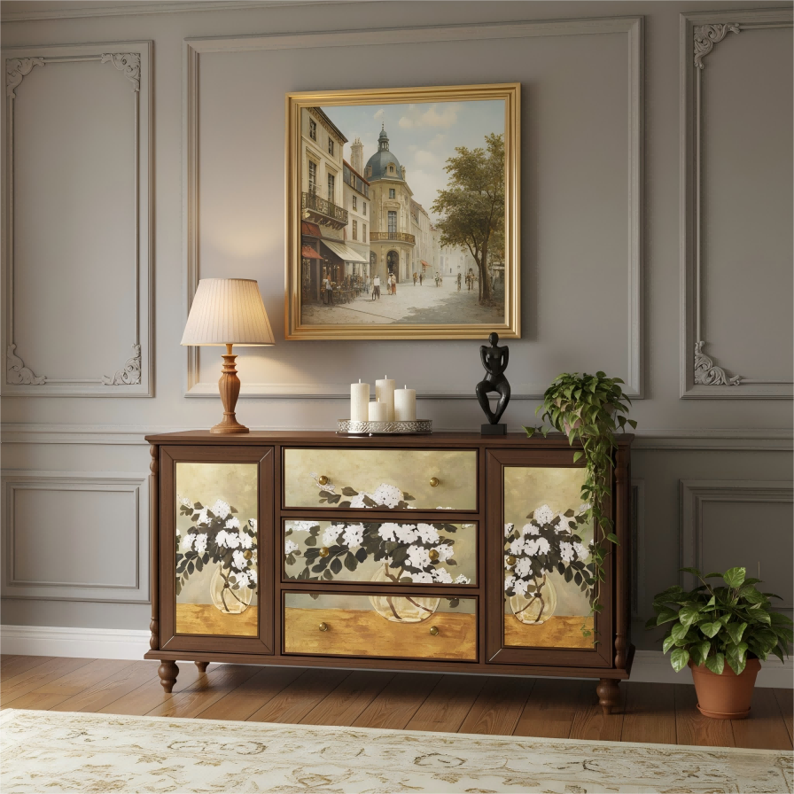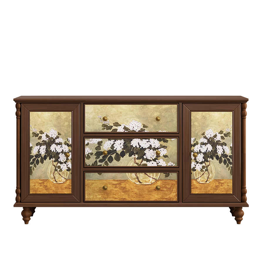ODM/OEM ServiceWe provide ODM/OEM service for this sideboard with two doors, three drawers, floral printed or painted panels and turned legs in a warm wood tone. Length, depth, storage layout, artwork pattern, stain color and knob style can all be customized for dining rooms, living rooms or entrance halls.