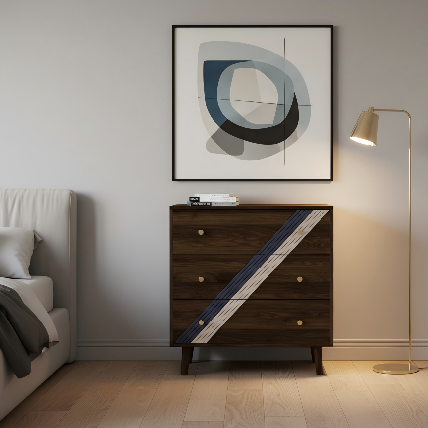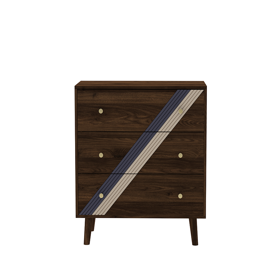 ODM/OEM ServiceWe provide ODM/OEM service for this 3-drawer cabinet in a dark wood finish, featuring a diagonal inlay “sash” detail across the front and slim round legs. Size, drawer depth, stripe material (paint, veneer or foil), wood color and knob style can all be customized for bedroom, hallway or living-room use.