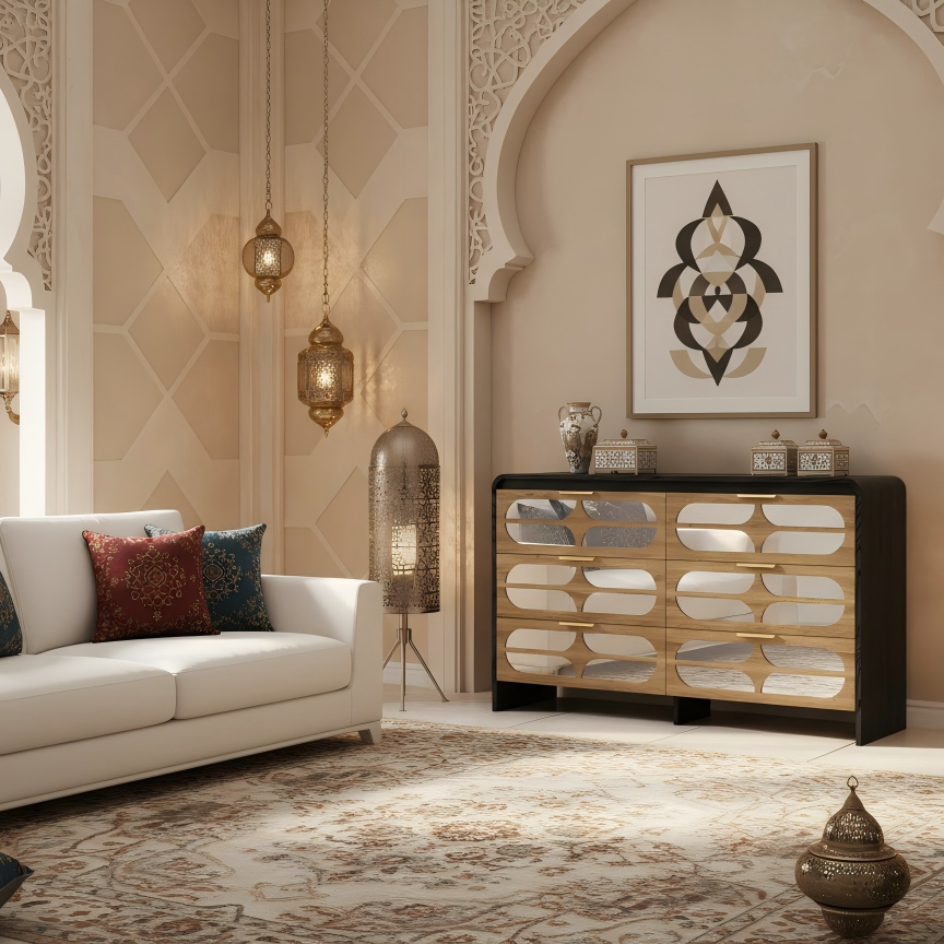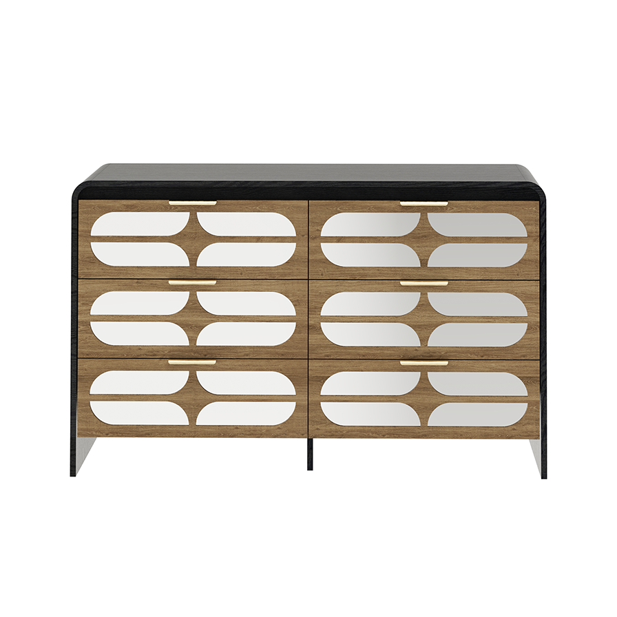 ODM/OEM ServiceWe provide comprehensive ODM/OEM services for the Lattice Mirrored furniture series, which includes accent cabinets, dressers, sideboards, media consoles, and console tables. This Modern Glam collection is defined by its dark, curved frame, a striking gold-toned metal lattice overlay, and premium mirrored panels behind the lattice. Customization is fully available on all key elements: overall dimensions (W/D/H), frame color/finish, metal accent color/material, and the tint or reflectivity of the mirrored panels.
