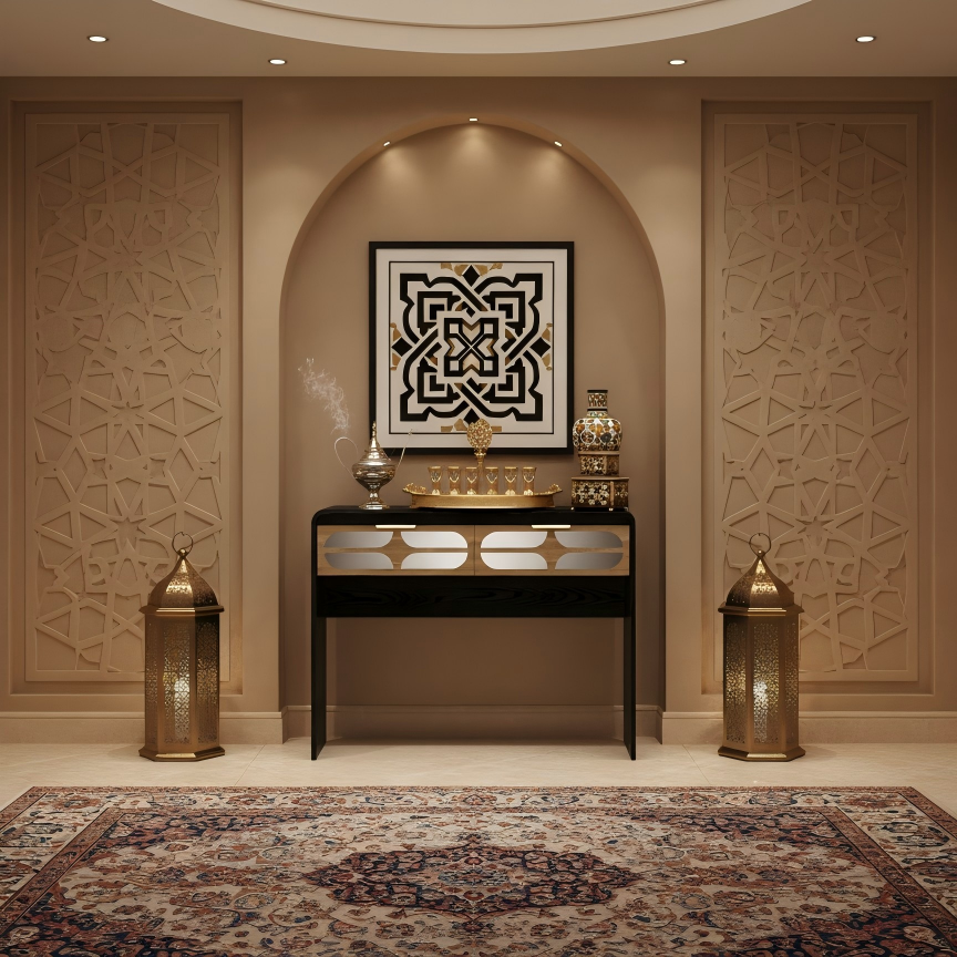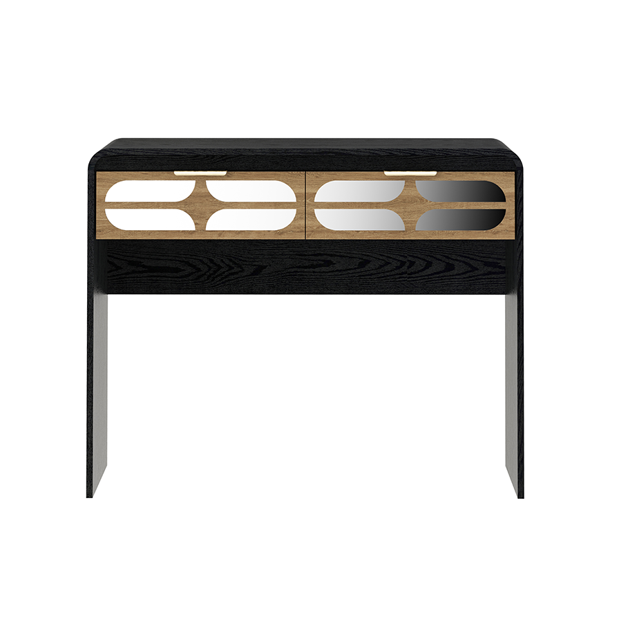 A 100×40×80 cm console/writing desk with a matte-black, soft-radius case and warm wood graphic drawers finished with slim brass pulls. The rounded profile and high-contrast natural tones align with 2025 trends for curves and geometric texture, while the 40 cm depth keeps halls and studios feeling open.