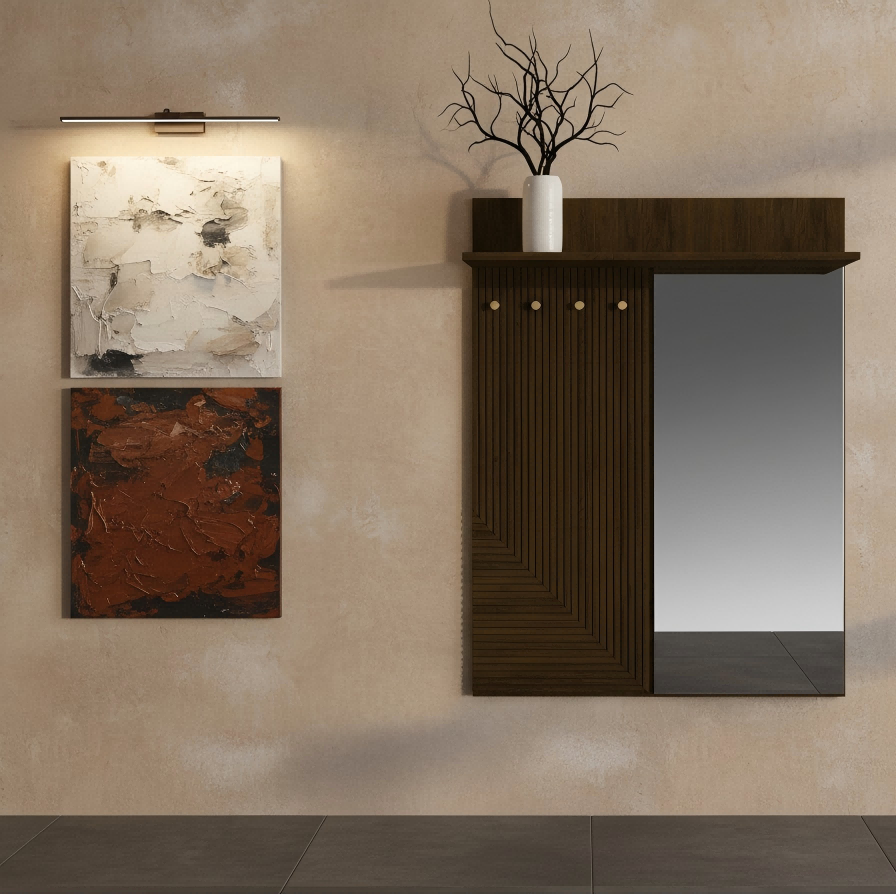 A slim wall system that blends vertical fluting, warm walnut tone and a full-length mirror. Brass pegs punctuate the rhythm of lines, bringing order and a touch of jewelry to everyday entry routines.