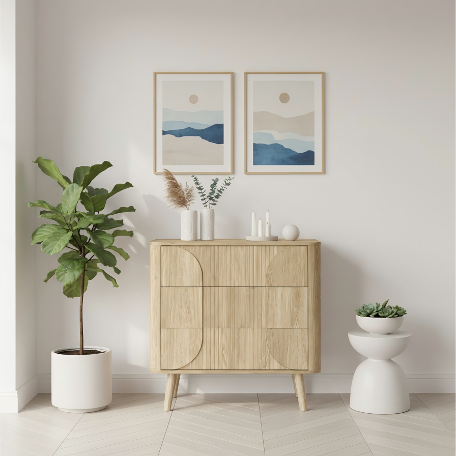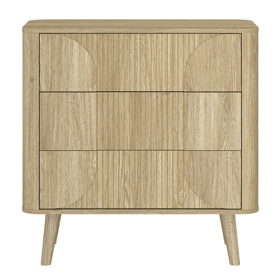 A compact 3-drawer chest (80×39×80 cm) in light oak with rounded corners, slim tapered legs and a playful half-moon grid over fine vertical ribs. The soft geometry lands squarely in 2025’s gentle-curves + pale-wood trend, while the 39-cm slim depth keeps apartments and hallways feeling open.