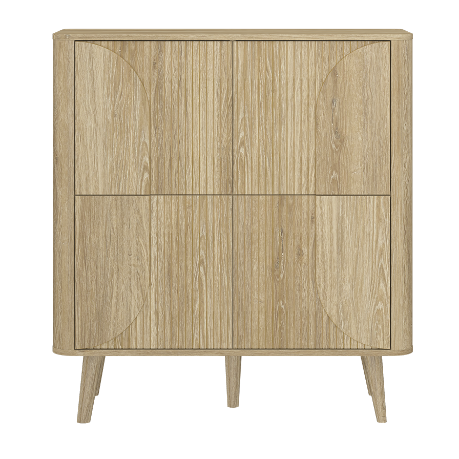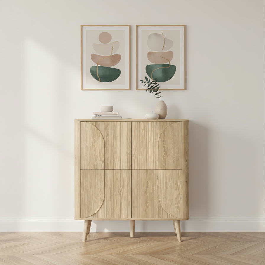 Soft-Nordic geometry in light oak: vertical fluting meets half-oval overlays, rounded corners, and slim tapered legs. Hidden doors keep the front clean while offering generous, modular storage.