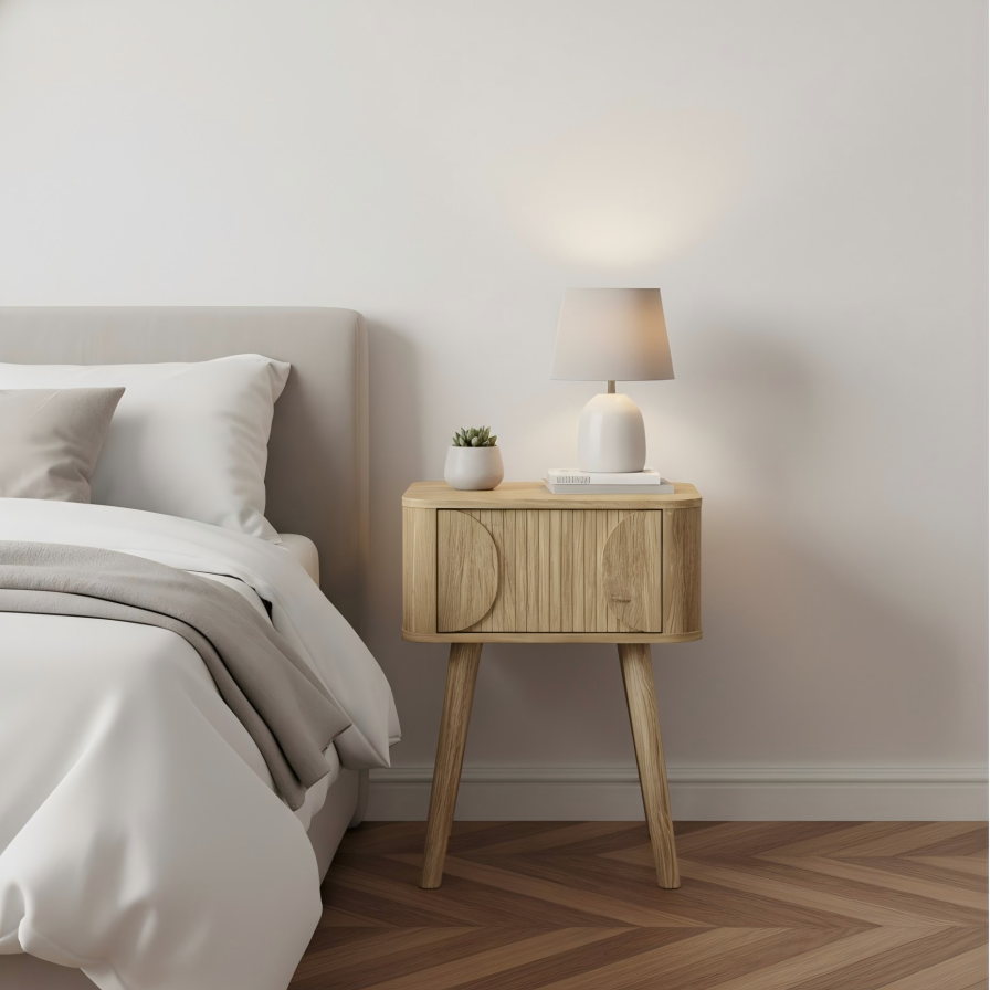 A compact nightstand (48×39×60.5 cm) in light oak with soft, rounded edges and splayed legs. A fluted door with half-moon overlays brings a playful neo-Scandi note—clean, tactile, and airy for 2025’s trend toward gentle curves and pale woods.