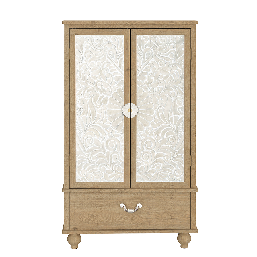 A tall, compact armoire where blooming daisy relief panels meet a warm-oak frame. Turned bun feet and soft corners bring a handcrafted cottage calm to small spaces.