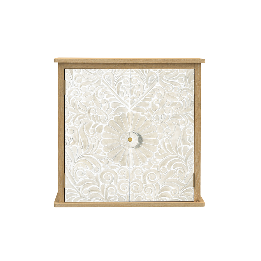 A wall-hung cube cabinet with a daisy-relief door and oak surround—small depth, big character; perfect for bath, entry, or kitchen nooks.