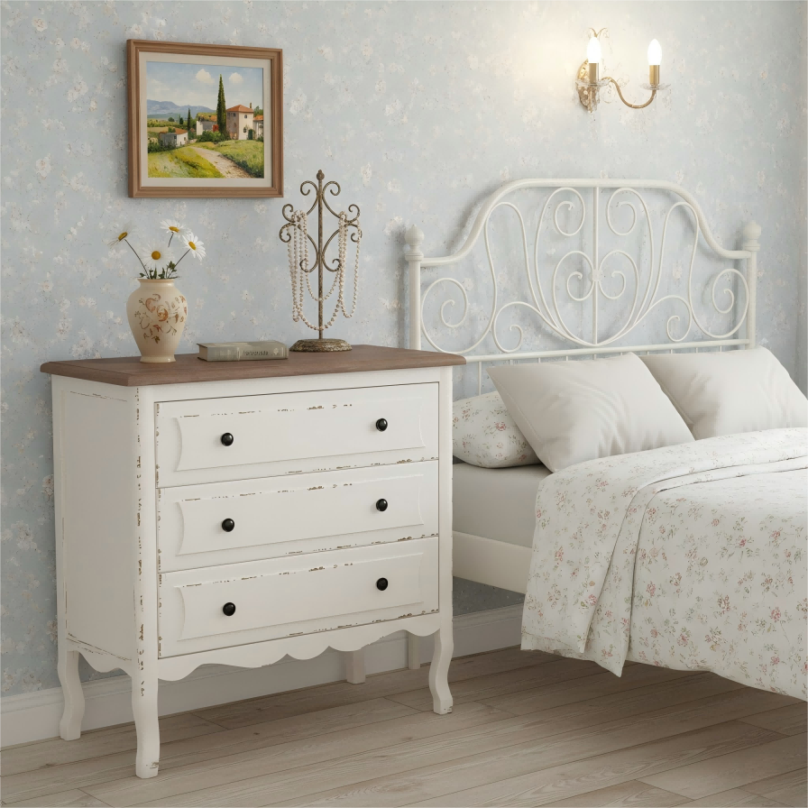 ODM/OEM ServiceWe offer ODM/OEM services for this charming Rustic/Cottage furniture collection, defined by its classic two-tone finish: a light wood-stained top paired with a distressed white/cream base. The series includes dressers, nightstands, and console tables, featuring traditional detailing like moulded drawers and bun/curved legs. Full customization is available on: overall dimensions (W/D/H), the color and finish of both the top and base (including level of distressing), leg style, hardware design (knob/handle), and drawer configuration (number and size).
