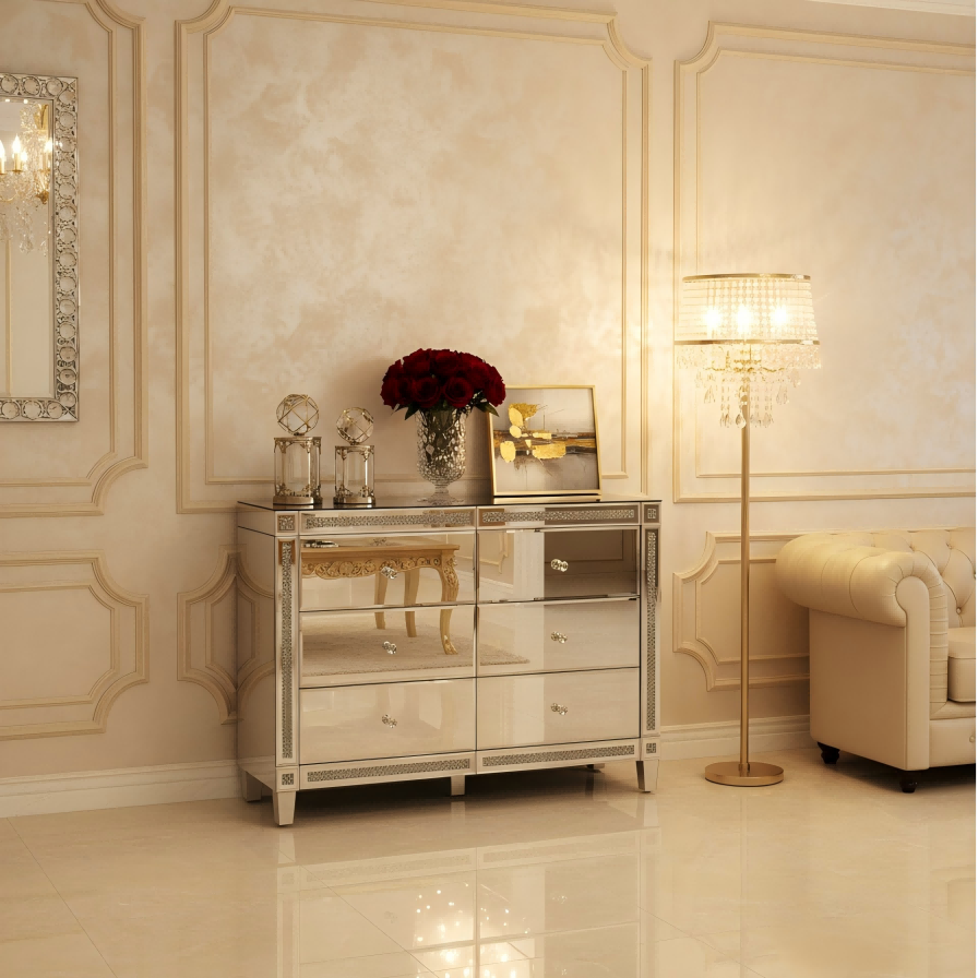 ODM/OEM ServiceWe provide comprehensive ODM/OEM services for this luxury furniture series, defined by its fully mirrored surfaces and distinct crushed diamond/sparkling inlay borders. This extensive line includes dressers, accent cabinets, console tables, and media consoles (including an optional fireplace unit). Full customization is available on: overall dimensions (W/D/H), the color/tint of the glass/mirror, the color/material of the crushed diamond inlay (silver, gold, etc.), the style and material of the crystal/acrylic hardware, and the base design (legs or plinth).