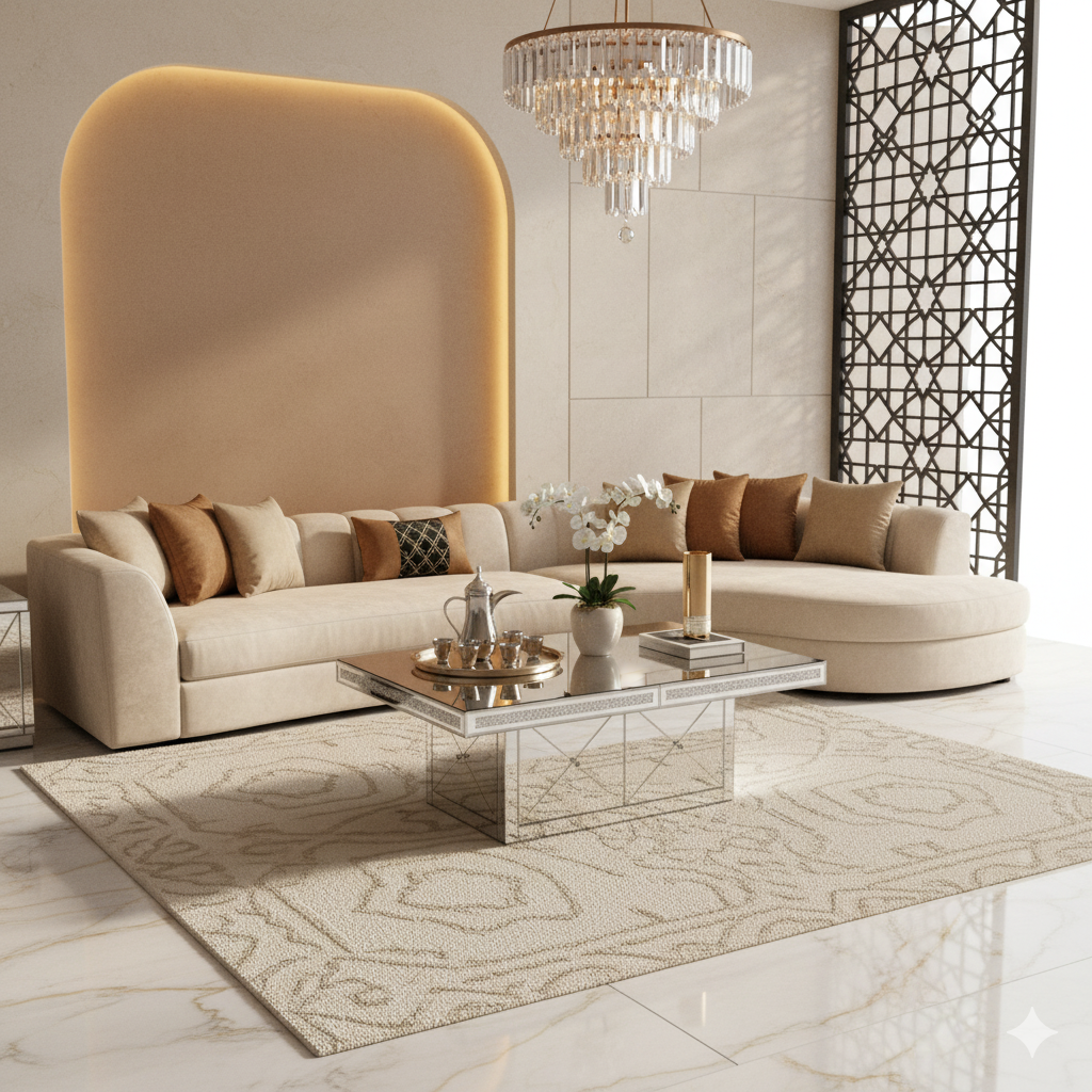 Low, lounge-friendly proportions with faceted mirror detailing deliver sparkle without visual weight.