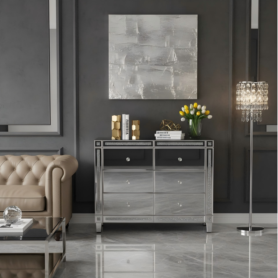 ODM/OEM ServiceWe provide comprehensive ODM/OEM services for this luxury furniture series, defined by its fully mirrored surfaces and distinct crushed diamond/sparkling inlay borders. This extensive line includes dressers, accent cabinets, console tables, and media consoles (including an optional fireplace unit). Full customization is available on: overall dimensions (W/D/H), the color/tint of the glass/mirror, the color/material of the crushed diamond inlay (silver, gold, etc.), the style and material of the crystal/acrylic hardware, and the base design (legs or plinth).
