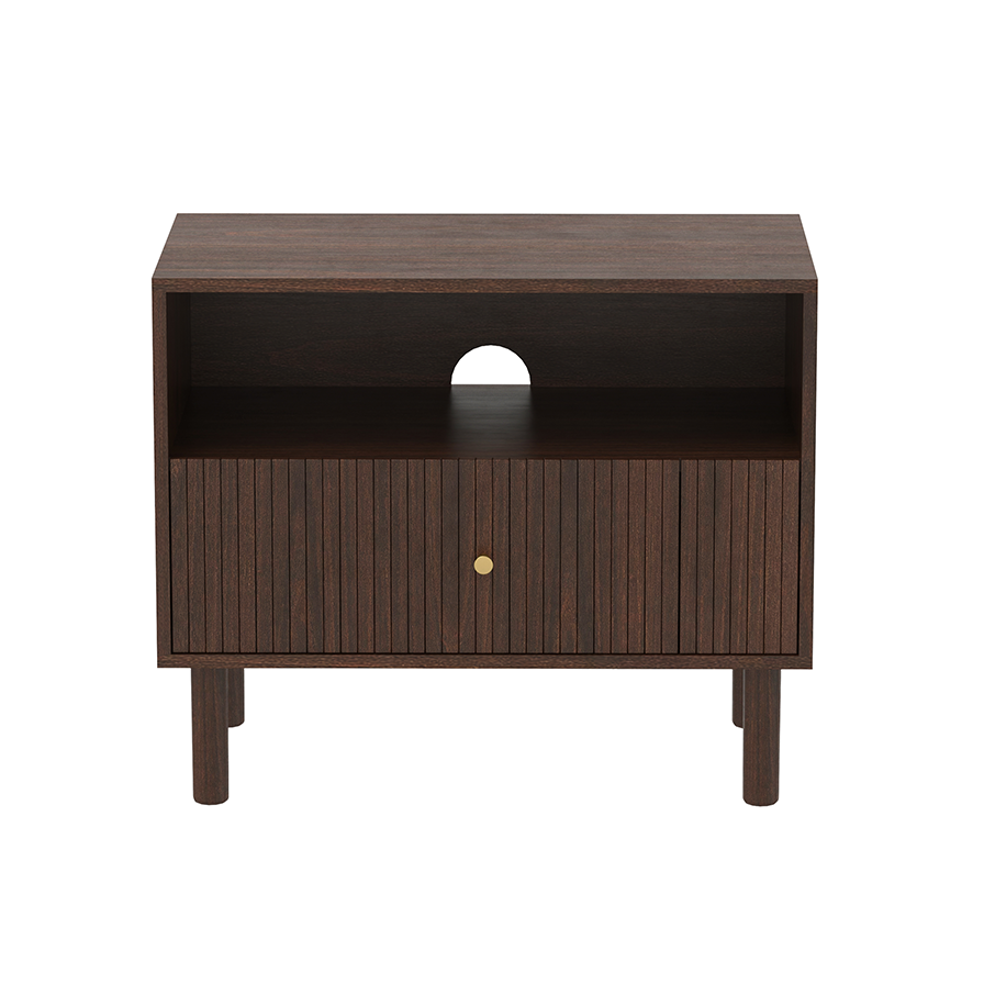 Boxy mid-century silhouette with a fluted drawer, open cubby, and rear cable port. Warm walnut finish, brass knob, and slim round legs for a clean, modern look.
