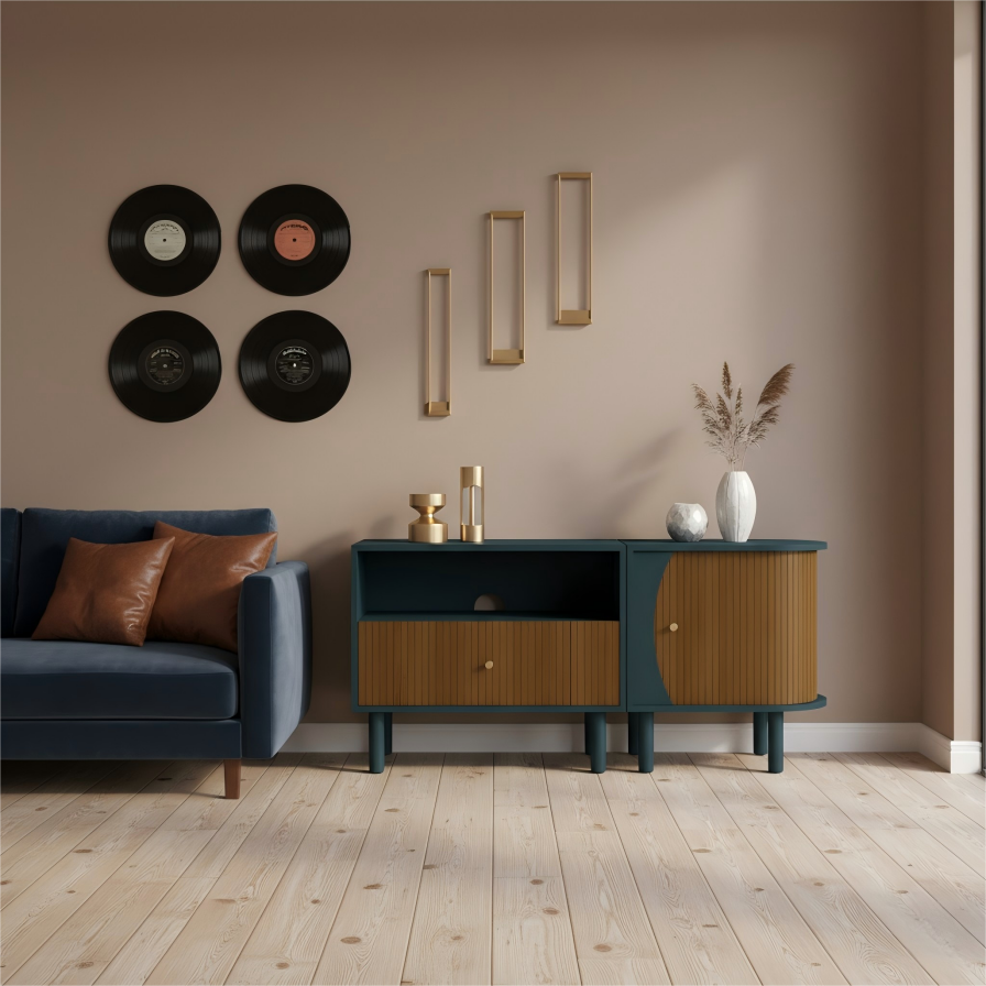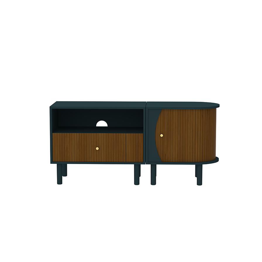 ODM/OEM ServiceWe provide ODM/OEM service for this capsule-shaped fluted series with rounded ends, multi-leg base and brass knobs, available in full walnut or color-blocked versions. TV units, cabinets and nightstands can be customized in length, height, storage layout, leg spacing, carcass color, fluted door décor and cable-management details to suit different markets and room sizes.