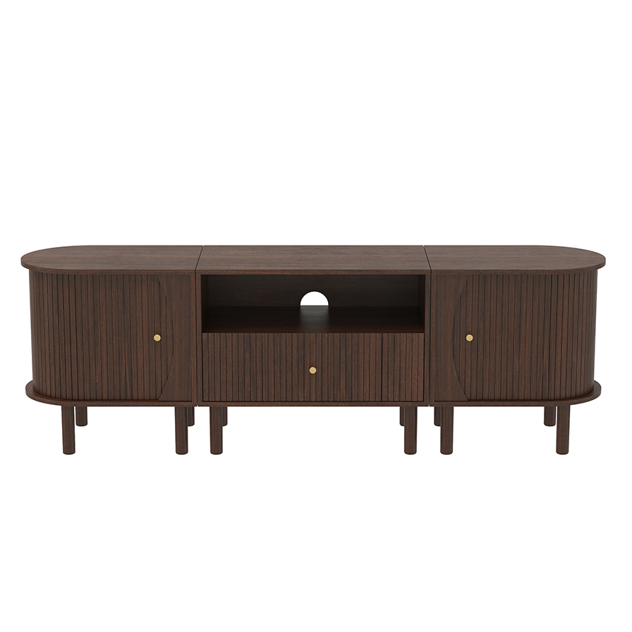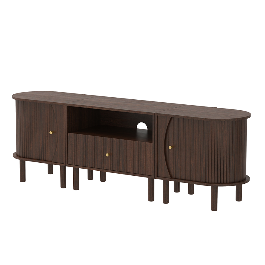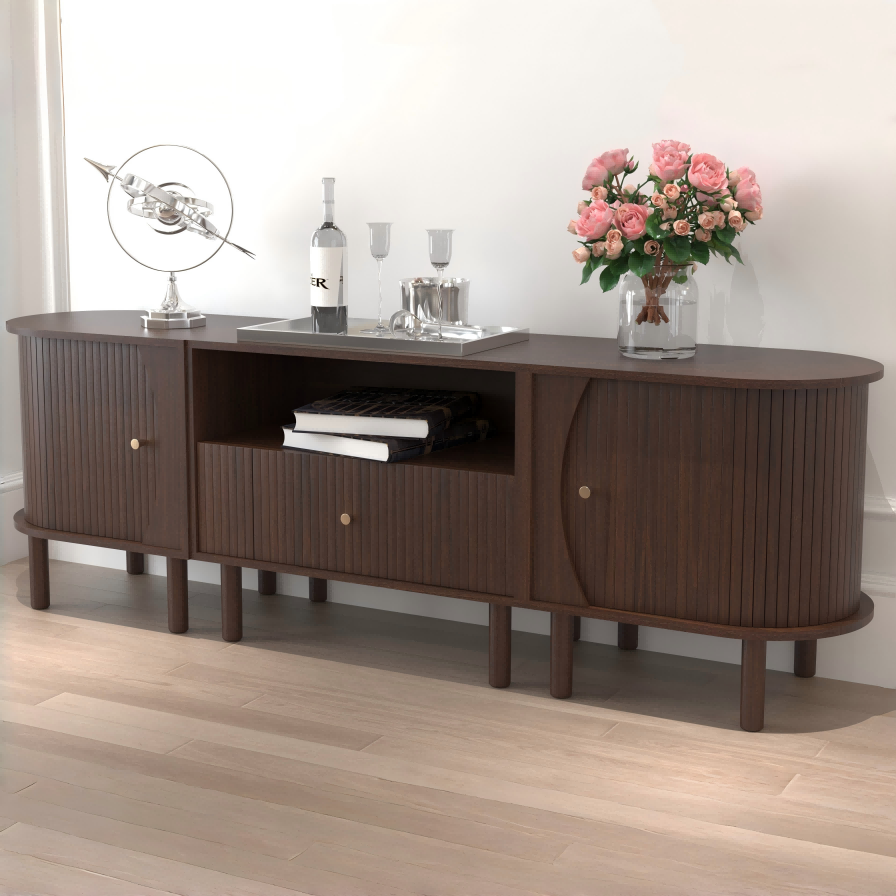 ODM/OEM ServiceWe provide ODM/OEM service for this capsule-shaped fluted series with rounded ends, multi-leg base and brass knobs, available in full walnut or color-blocked versions. TV units, cabinets and nightstands can be customized in length, height, storage layout, leg spacing, carcass color, fluted door décor and cable-management details to suit different markets and room sizes.