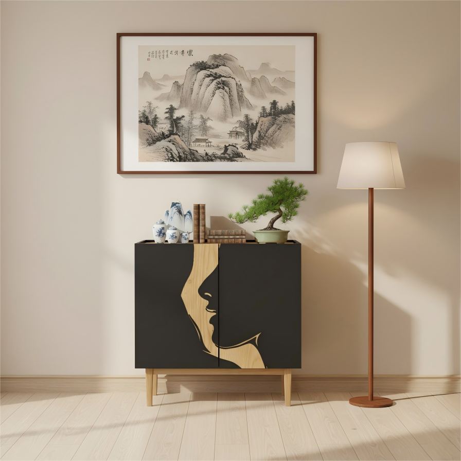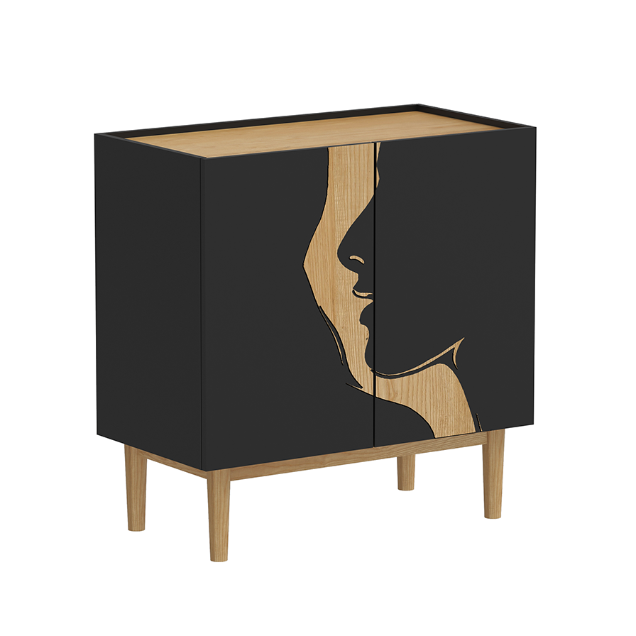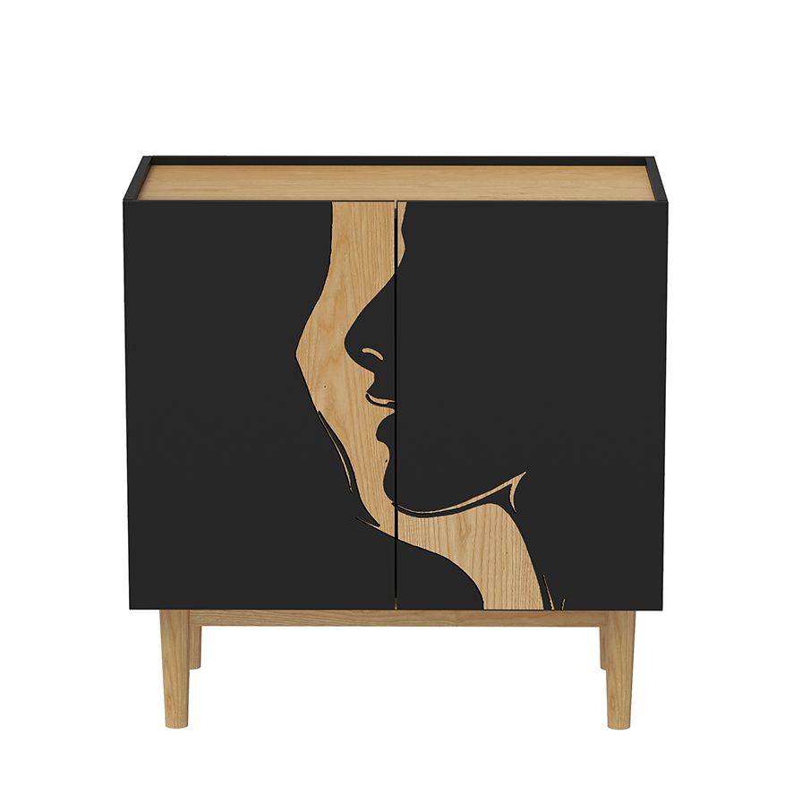 A minimalist two-door cabinet featuring a sculpted profile silhouette in natural oak against a matte black field—graphic, poetic and instantly recognizable.