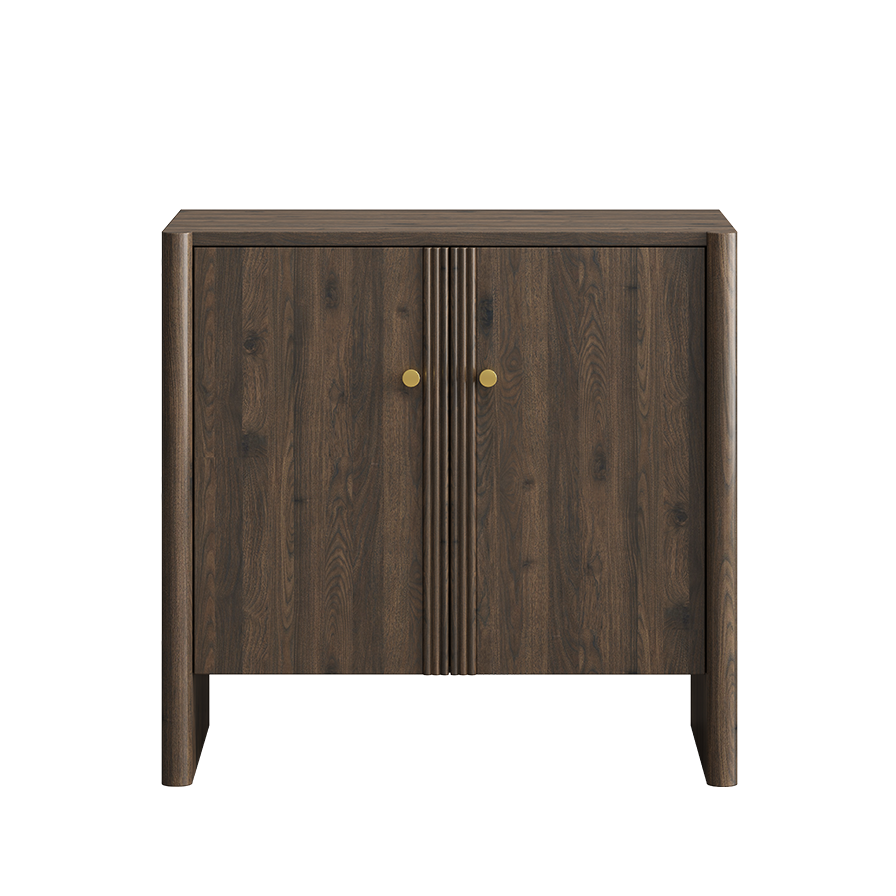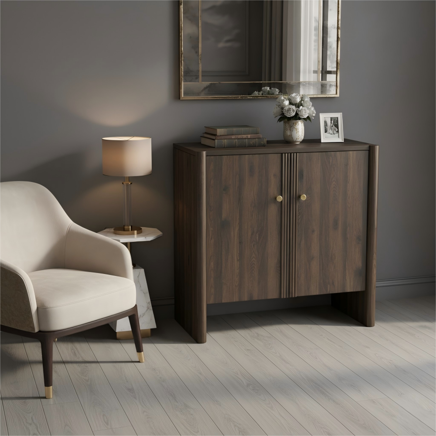 A compact 2-door cabinet (80×40×76.5 cm) in a deep walnut tone, framed by rounded corner posts and a slim fluted center line, finished with soft brass knobs. The tailored, hotel-lounge vibe keeps rooms calm, while the 40-cm slim depth slides neatly into entries, dining nooks and apartments.