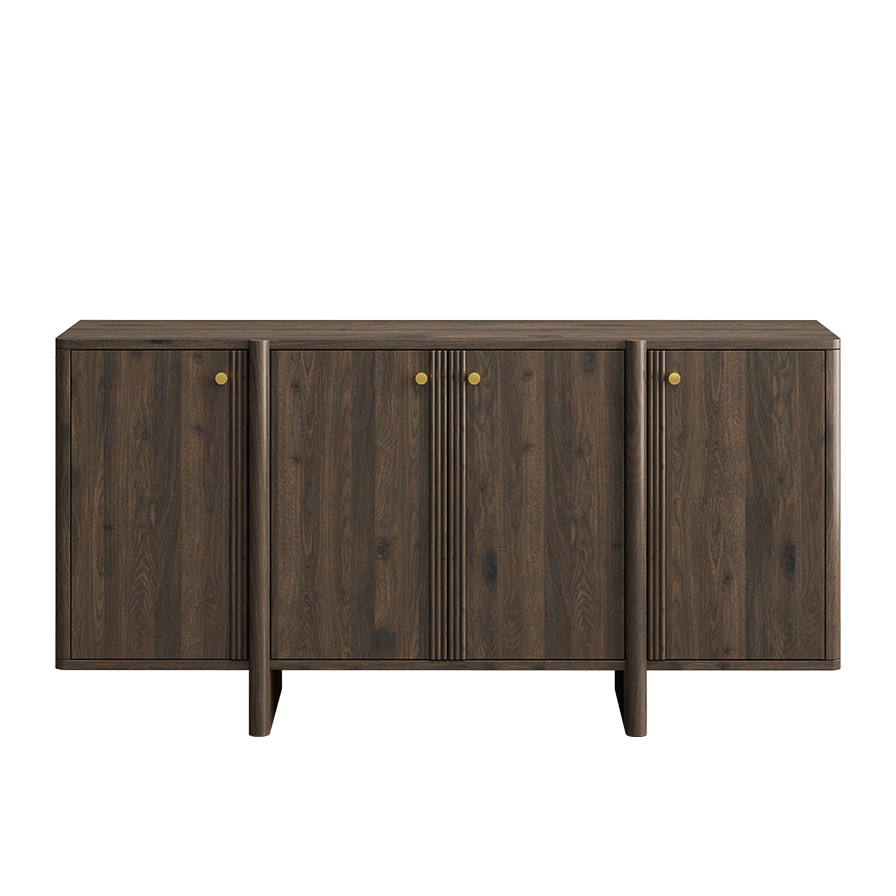 The Next Bestseller:160-cm span fits long walls; four doors hide dinnerware, barware or media gear.Dark wood + brass = high perceived value and photography-friendly contrast.Apartment-smart depth; adjustable shelves and OEM/ODM finishes for quick localization.KD/RTA + ISTA-3A mail-order ready for safe, scalable shipping.