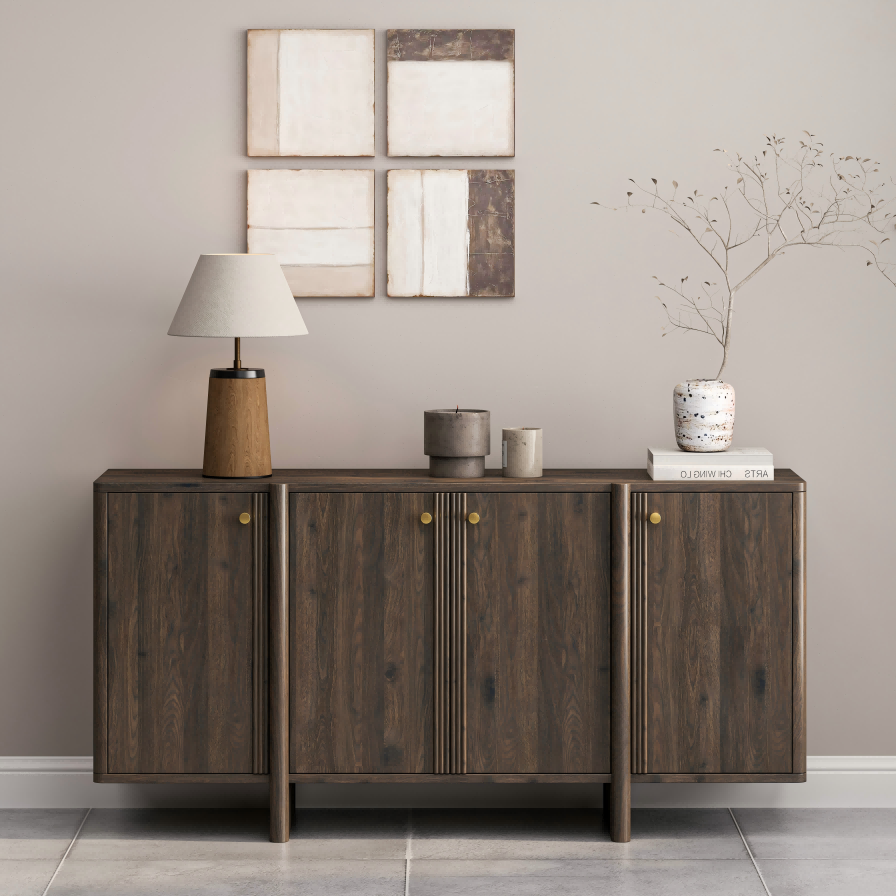 A 4-door sideboard (160×40×80 cm) defined by architectural symmetry: deep walnut-tone veneer, slender fluted stiles and rounded pilasters, finished with soft satin brass knobs. The long, low silhouette feels tailored and hotel-lounge chic—right in step with 2025’s dark woods + refined metal accents—while the 40-cm depth keeps dining and living spaces flowing.