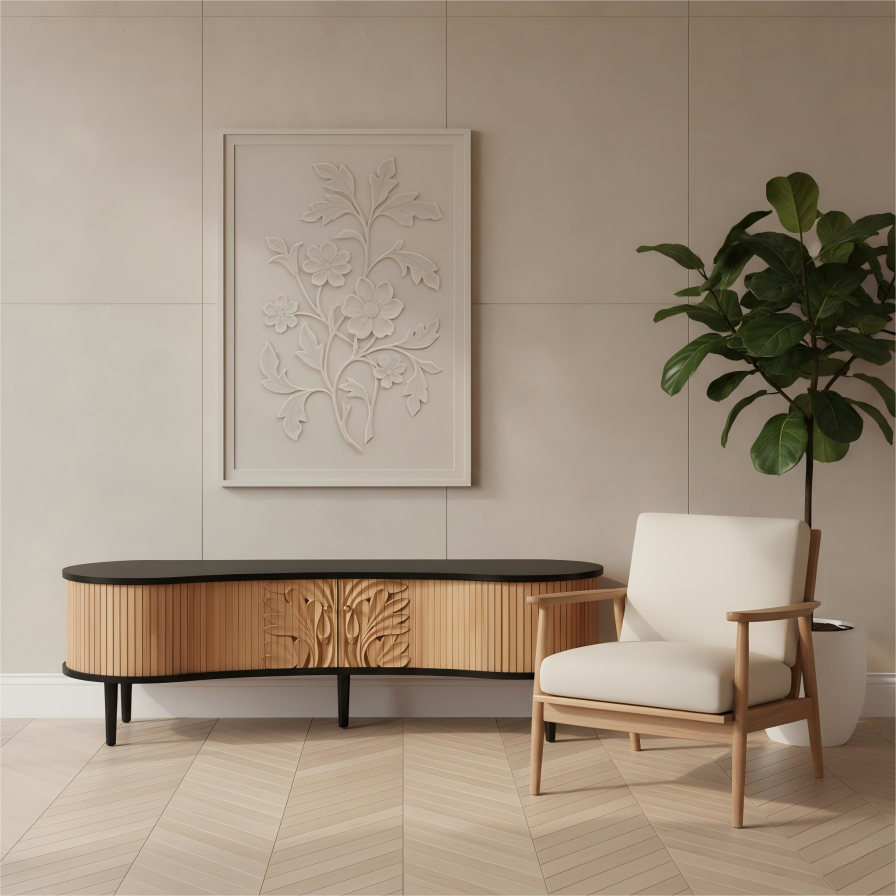 A sculpted, S-curve tambour facade flows across a matte black top and base, meeting at a hand-carved botanical medallion. Rounded edges, slim legs, and continuous vertical slats give the piece a soft, organic profile with gallery-level presence. The look bridges craft and contemporary—warm timber texture framed by crisp black.