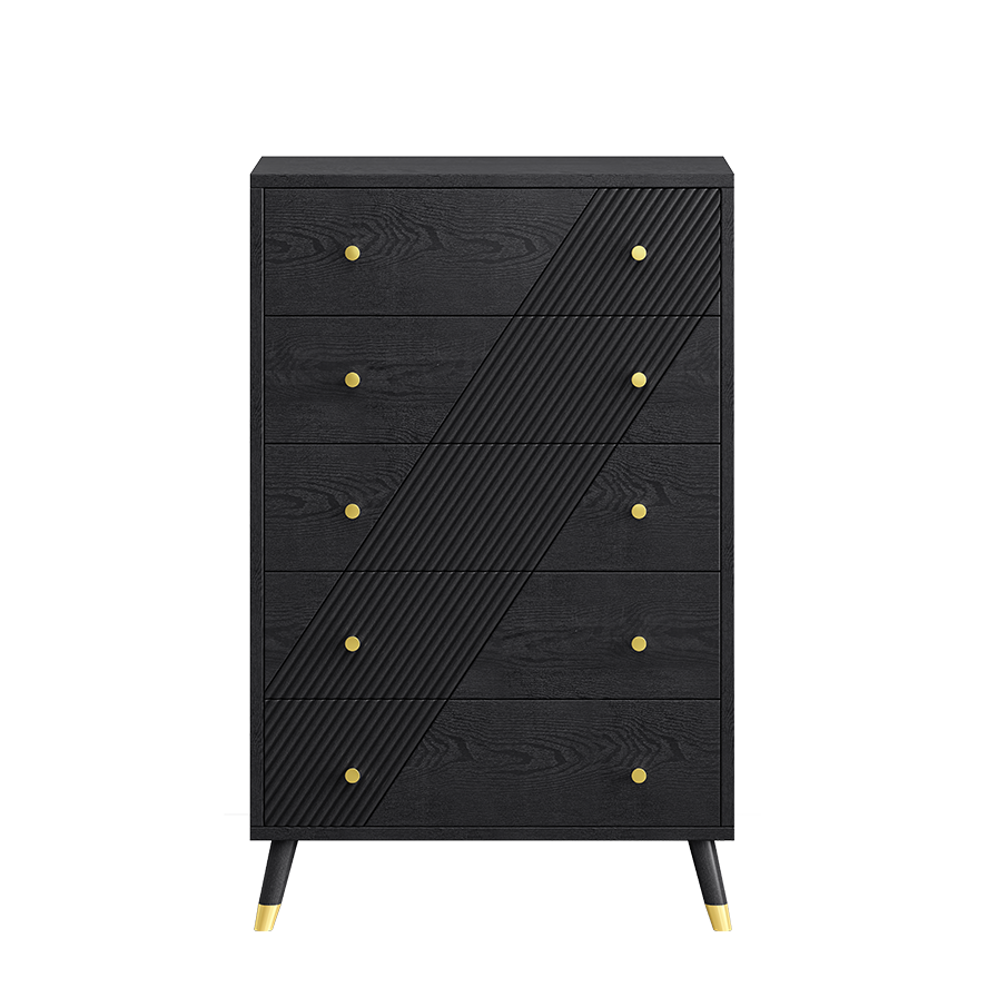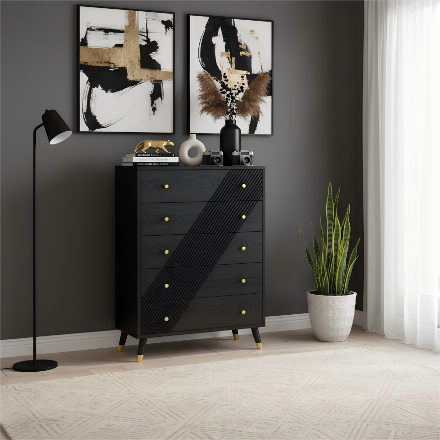 A 5-drawer tall chest (800×390×1150 mm) in deep black ash with a bold diagonal fluted band that adds movement across the façade. Slim, gold-tone knobs and gold-capped tapered legs elevate the silhouette, while the narrow 390-mm depth fits compact bedrooms and hallways.