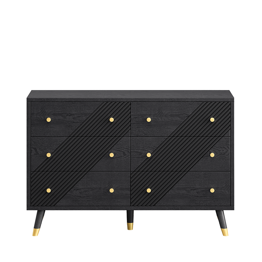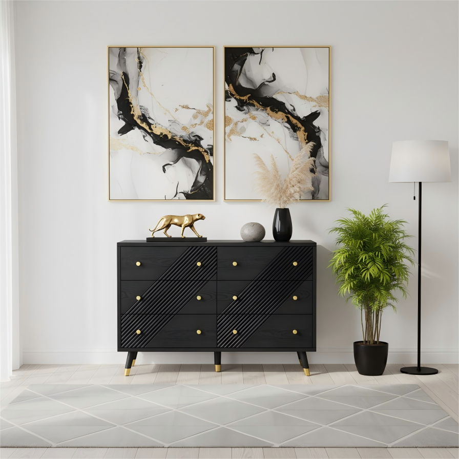 A refined 6-drawer dresser (1200×400×750 mm) in deep ebony ash. Two diagonal ribbed bands cut across the drawer fronts, adding movement and tactility, while brass-tone knobs and capped legs give a luxe, modern accent. Full-extension drawers keep storage smooth and practical for bedroom or entry.