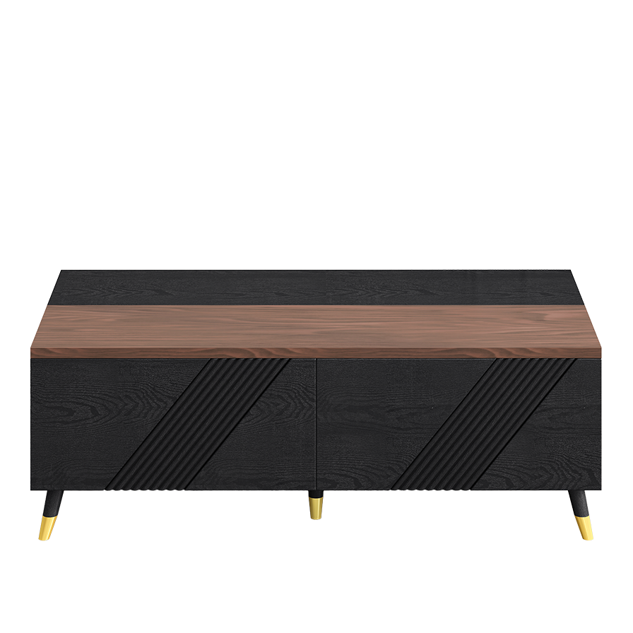 A lift-top coffee table (1200×600×400 mm) in matte black ash with diagonal fluted fascia and walnut-tone top. The gas-assist lift raises to laptop height while exposing a tidy storage bay; two full-width drawers keep remotes and chargers out of sight. Gold-capped legs finish a modern, tailored look.