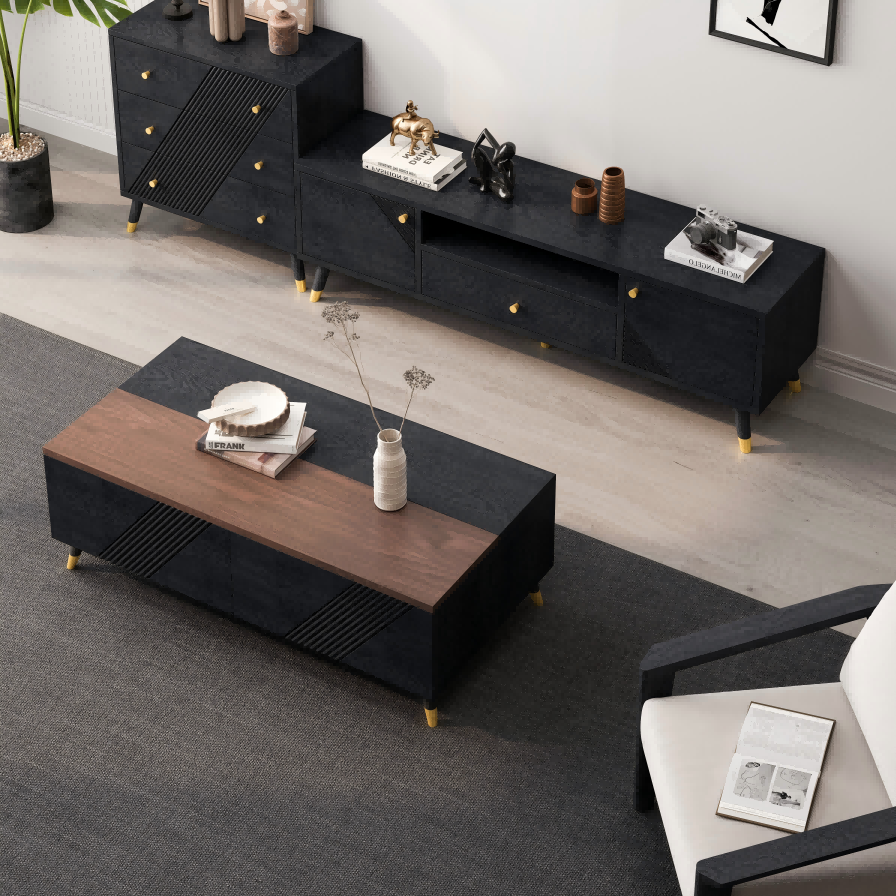 ODM/OEM ServiceWe offer flexible ODM/OEM service for this black modern series with diagonal ribbed bands, tapered legs with brass tips and matching brass knobs. TV units, cabinets, dressers, lift-top coffee tables and other matching items can be customized in size, storage layout, leg angle, finishes, band color/material and top options to fit your target market and test standards.