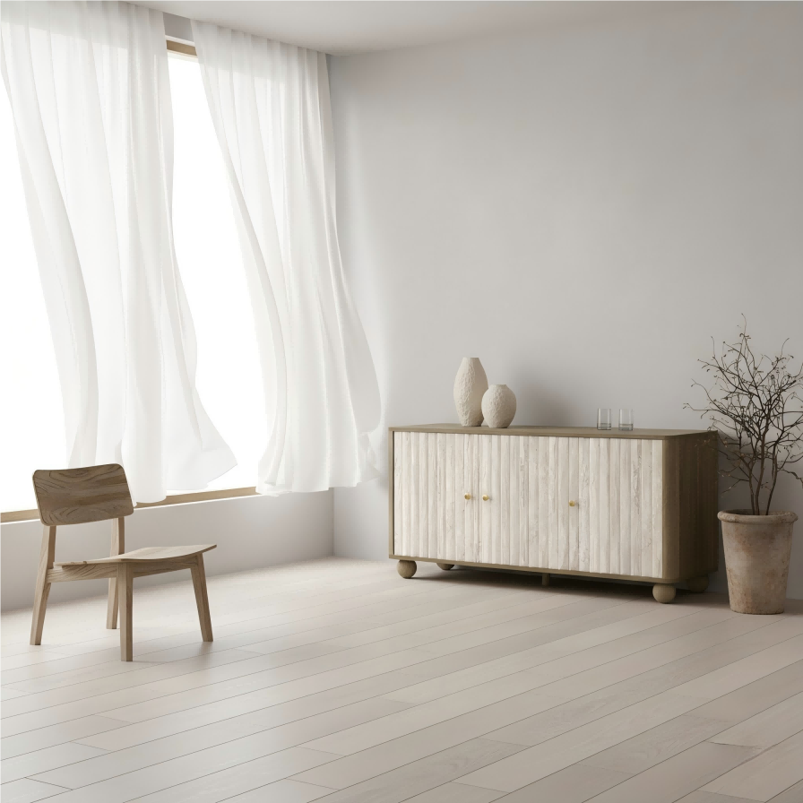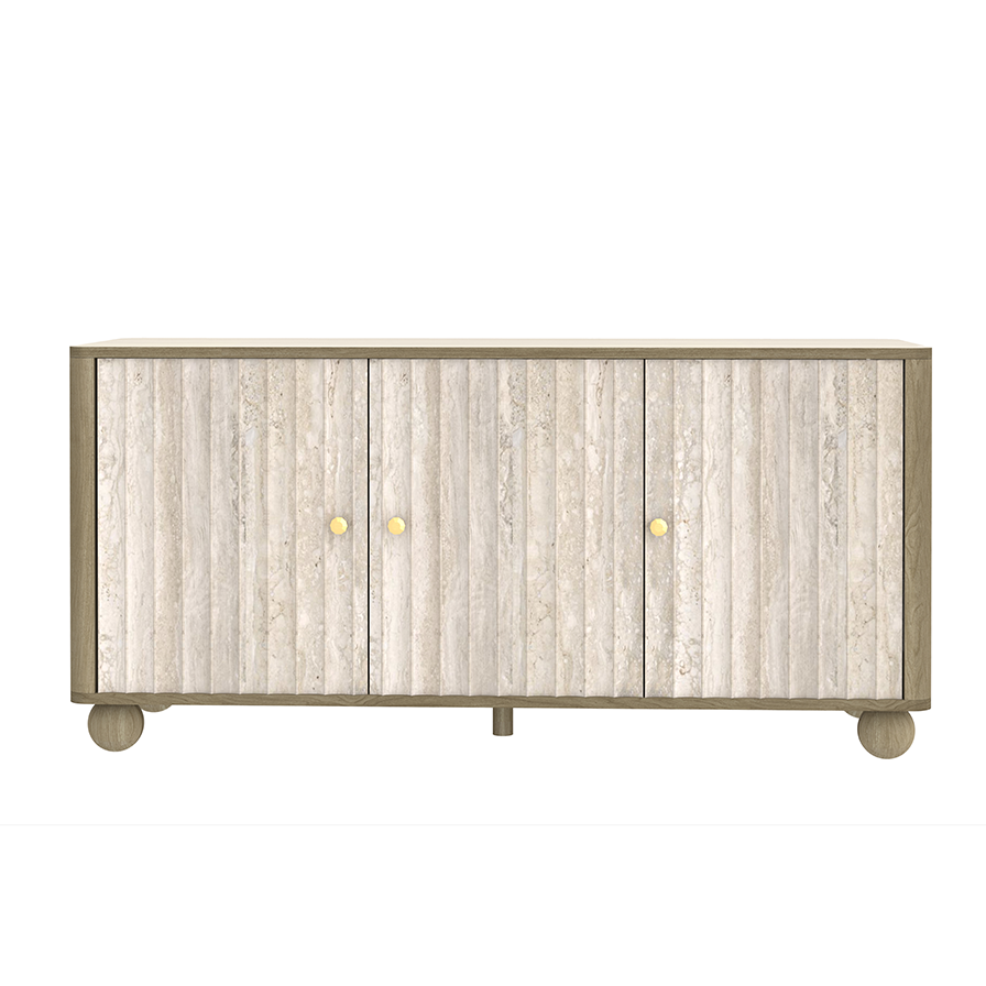 Long, linear cabinet wrapped in travertine tones—subtle texture that warms dining or hallway zones.