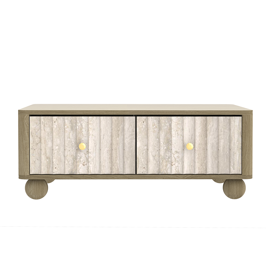 Low, generous proportions with travertine-tone doors sit on playful ball feet for a soft-edge look.
