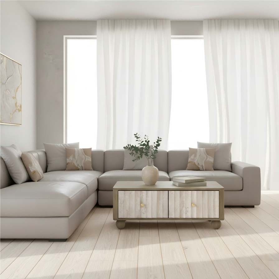 A1. A coffee table about two-thirds the length of the sofa is usually best. Leave 40–50 cm of clearance around the coffee table so people can walk comfortably.